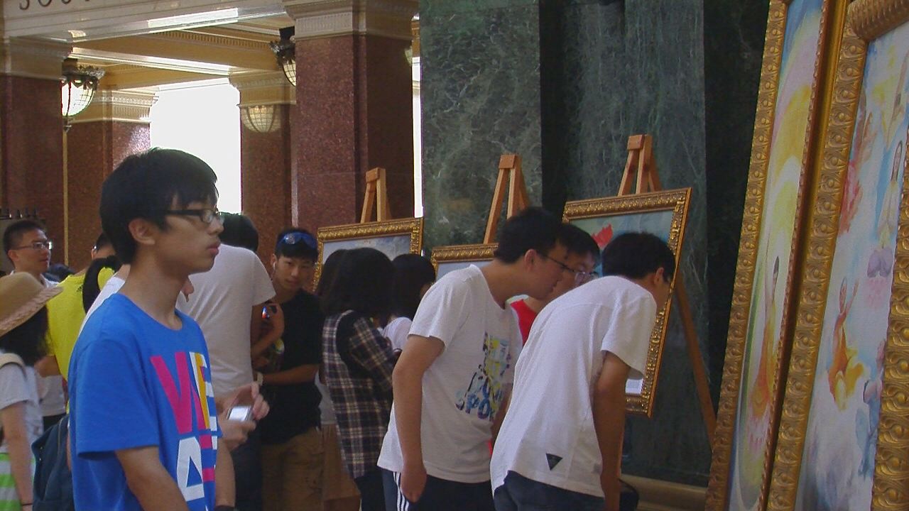 一个中学生组成的大陆旅游团来参观议会大厦,却不期而遇真善忍美展。学生们把很多画拍入手机,他们感到兴奋和好奇。还有一位学者模样的中国人,把学员送给他的莲花很珍惜地收下,表示要带回中国。