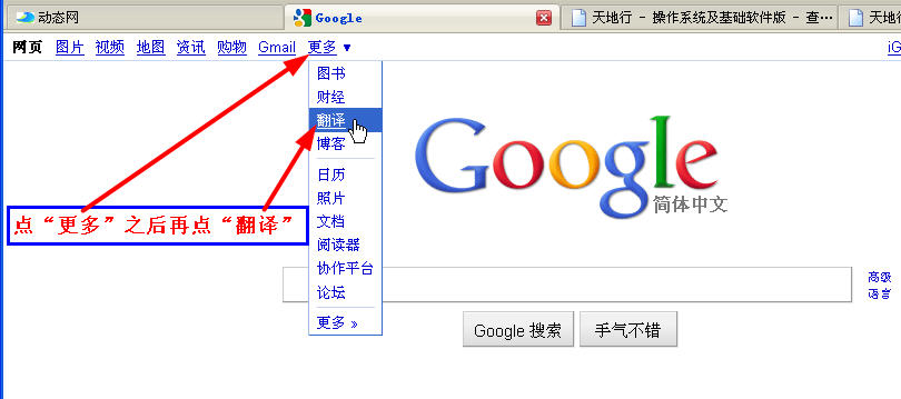 打开“谷歌(Google)”首页的方法,可以通过动态网首页点击“技术网站”的Google链接,或者在破网后的浏览器地址栏直接输入网址:www.google.com,网址这里要注意的是google.com,不是google.cn,虽然google.cn也有在线翻译功能,但因cn是中国大陆的域名,所以不建议使用。