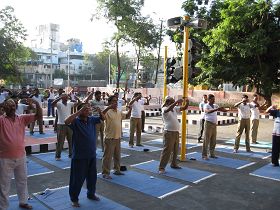 每年一月,印度法轮功学员都会在年度工业展览期间弘法,今年展览会期间,一位交通警详细询问了功法,并留下了联系电话,希望我们能够去交通警署介绍法轮功,然而遗憾的是学员联系了很多次都没有成功。直至最近,在一次看似偶然的情况下,终于和一个交警联系上,在他的帮助下,学员们和警署的主管,警务处处长讲了真相,介绍了法轮大法的背景,在得到允许后,学员们成功的在海得拉巴交通警署(HYDERABAD TRAFFIC POLICE)开办了两个星期的弘法班,近八十名警察参加了学习,并都表示非常喜欢法轮大法。