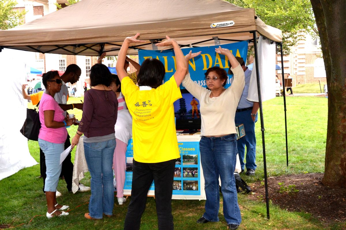 在鳞次栉比的参展商家的帐篷中也有当地法轮功学员的身影。他们的展位上陈列着多种法轮功书籍和真相资料,并以电视录像不间断地播放着法轮功功法演示。大费城明慧中文学校舞蹈队的小弟子们表演的莲花舞、腰鼓舞、扇子舞和现场的法轮功功法演示吸引了众人驻足观看,扩音器中传出的“法轮大法好”的嘹亮歌声在德拉华大学校园上空久久回荡。来法轮功展位咨询的游人络绎不绝,许多人留下了联系方式,表示要学炼法轮功,并有人当场请学员教功。