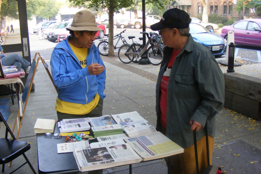 ![]() 法轮功学员在集市上设立摊位,传播大法真相 |