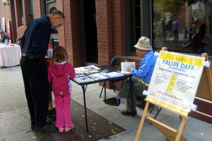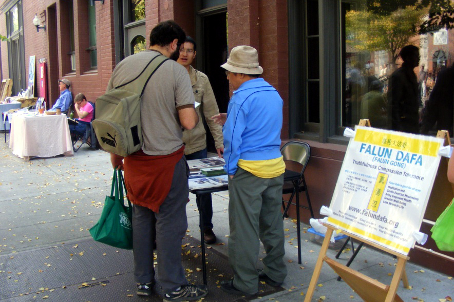我们几名学员早上六点,天蒙蒙亮就出发,六点半左右来到指定的展位,布置展位。到了八点,集市的人开始多起来,人们络绎不绝来到展位前和我们交谈,我们告诉他们什么是法轮大法,修炼之后对身心获得的益处,及中共邪党对善良的法轮功学员的残酷迫害等。对于残酷的迫害,人们都觉得不可思议,纷纷要求记下我们的联系方式,表示以后要学功。
