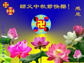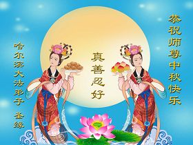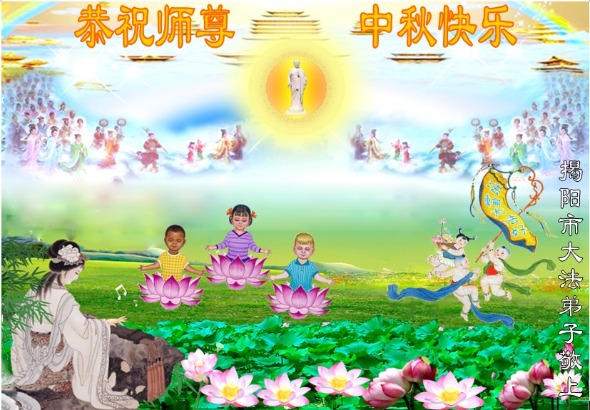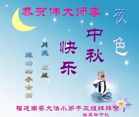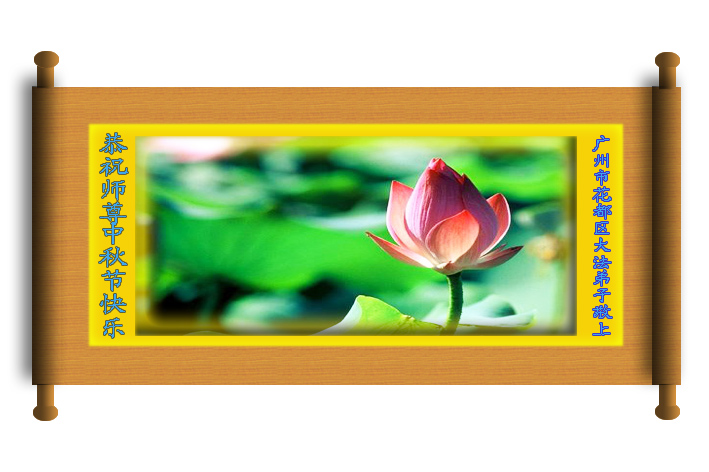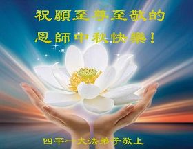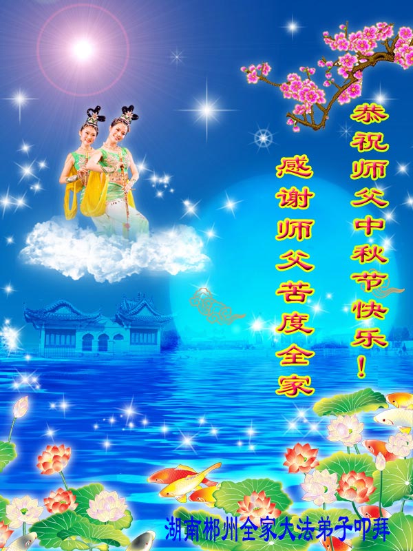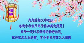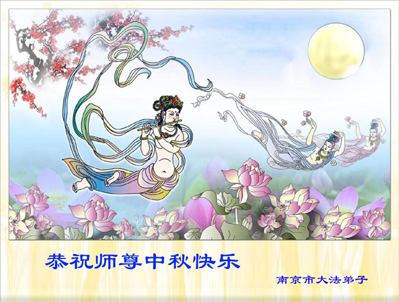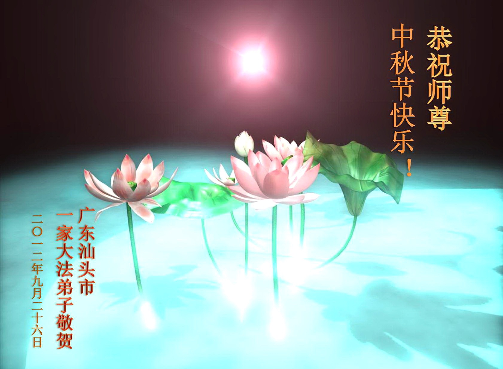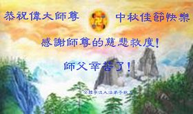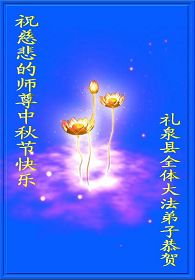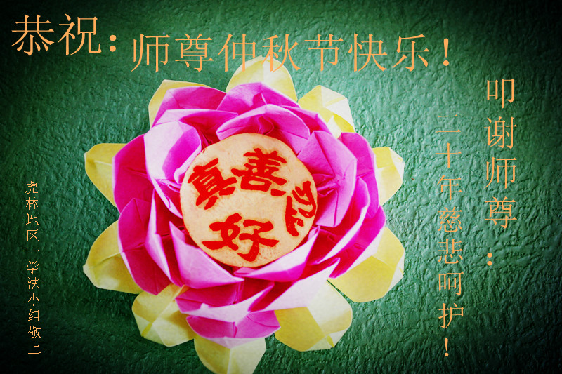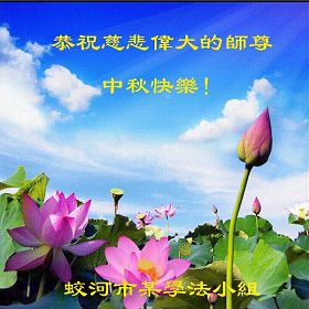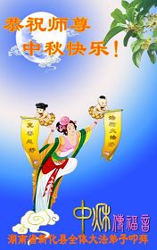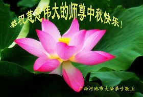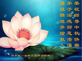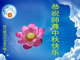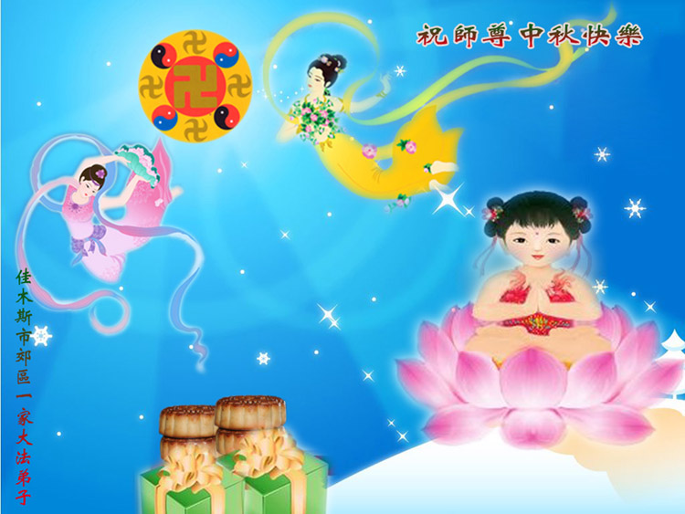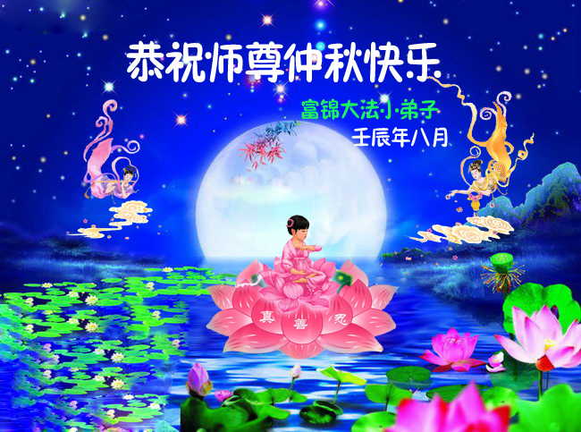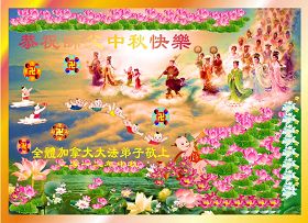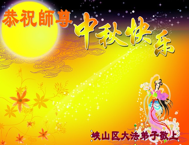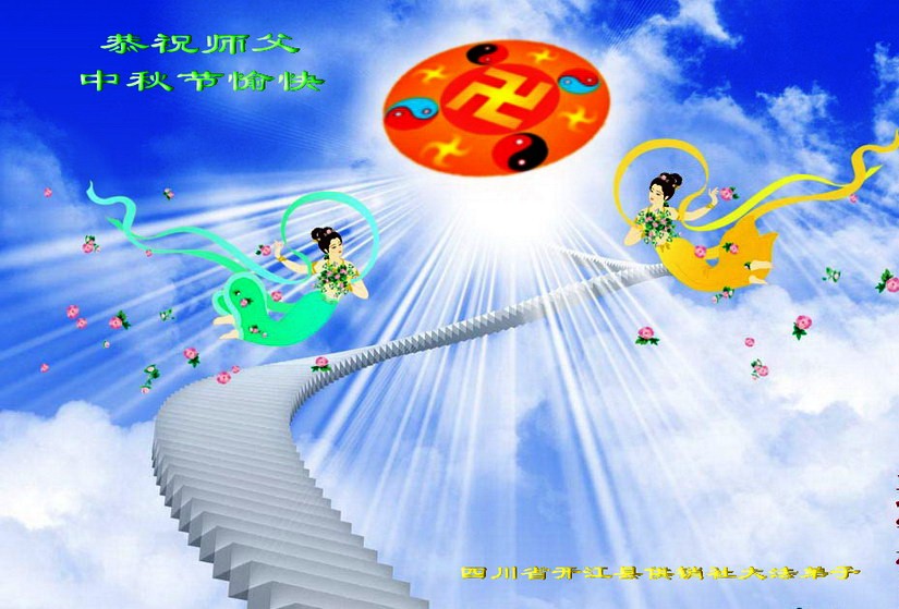 师尊好!又是一年的中秋佳节,我们非常想念师尊!祝师尊中秋节快乐!能成为大法弟子,我们感到非常荣耀和幸福。正法洪势突飞猛進,我们大法弟子不忘自己的使命,每天讲真相救众生,努力做好三件事。彼此沟通、互相配合、共同精進,圆满随师还。
