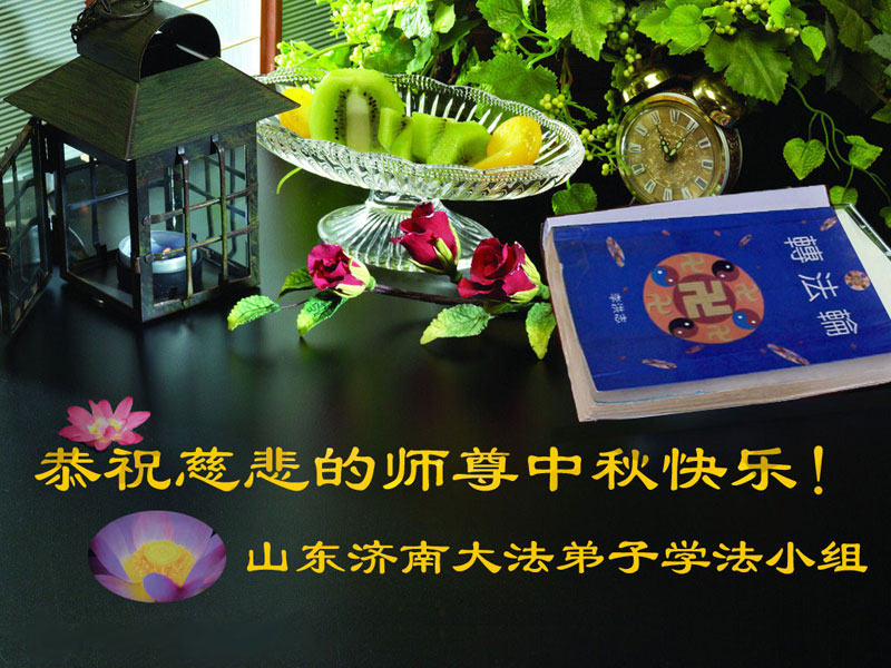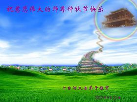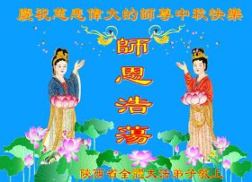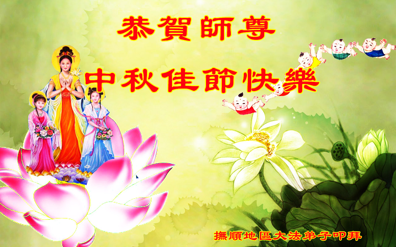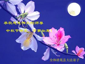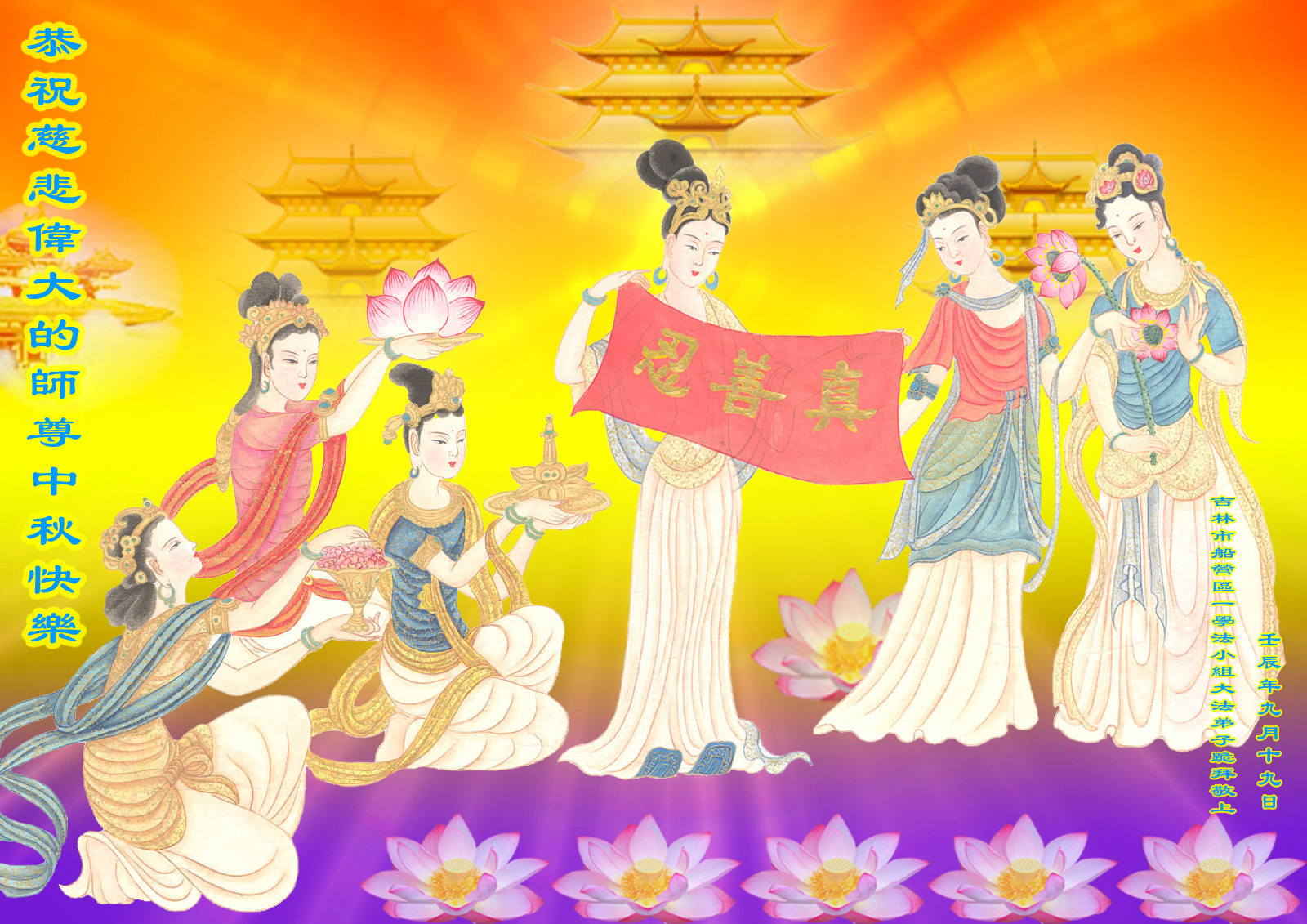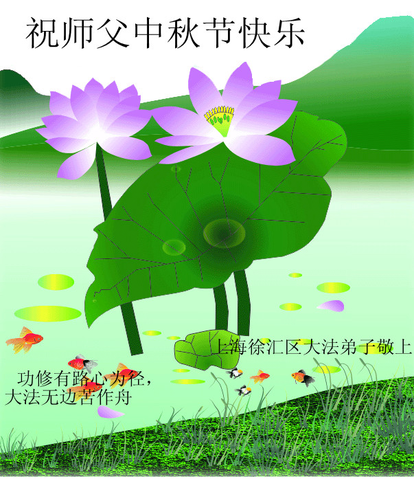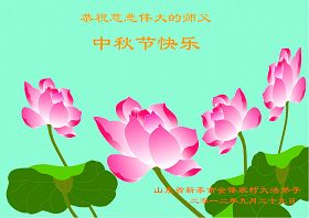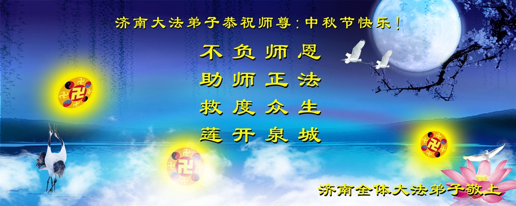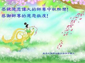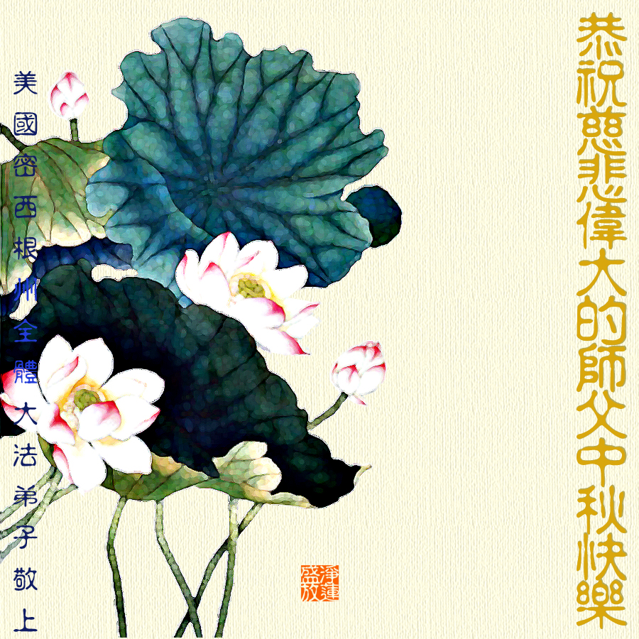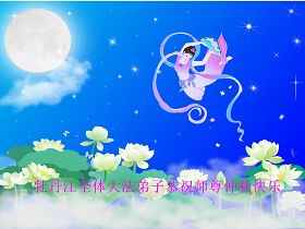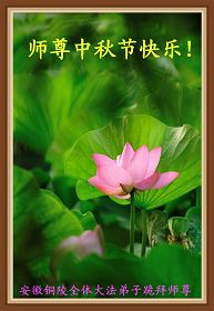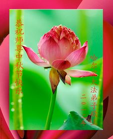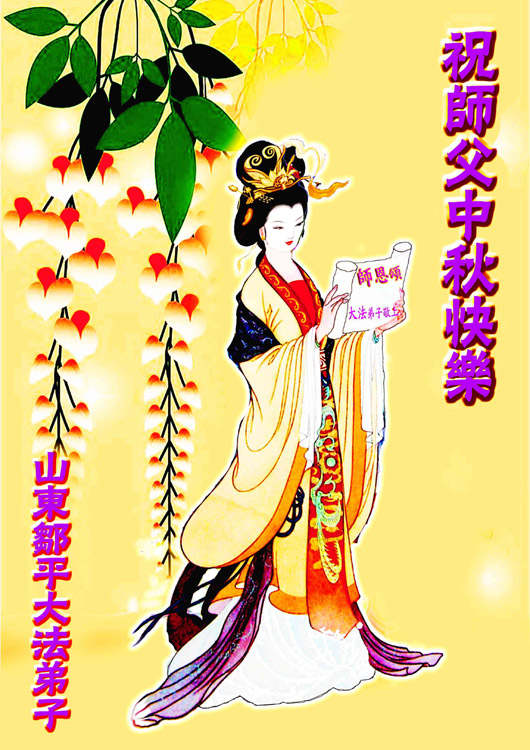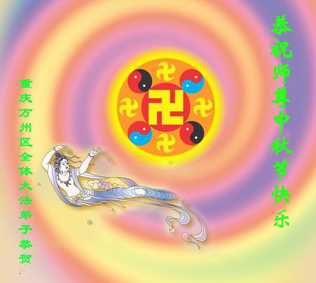 师尊好!又是一年的中秋佳节,我们非常想念师尊!祝师尊中秋节快乐!能成为大法弟子,我们感到非常荣耀和幸福。正法洪势突飞猛進,我们大法弟子不忘自己的使命,每天讲真相救众生,努力做好三件事。彼此沟通、互相配合、共同精進,圆满随师还。