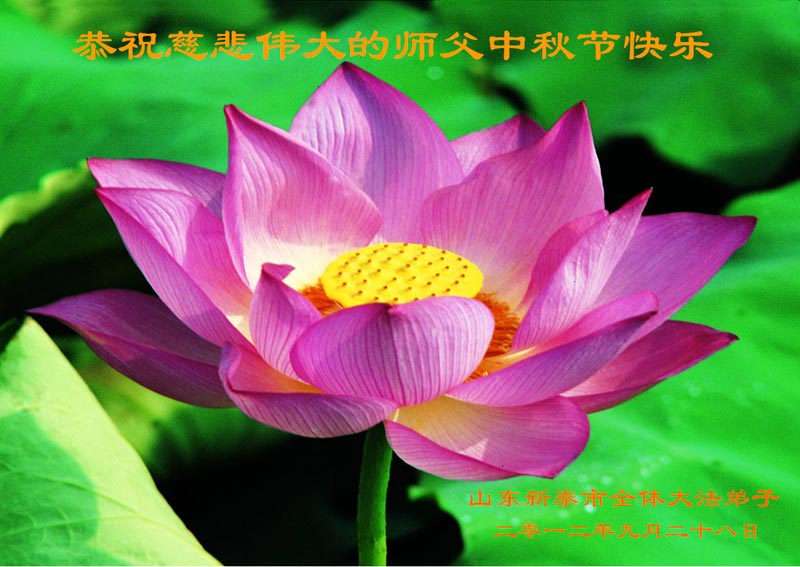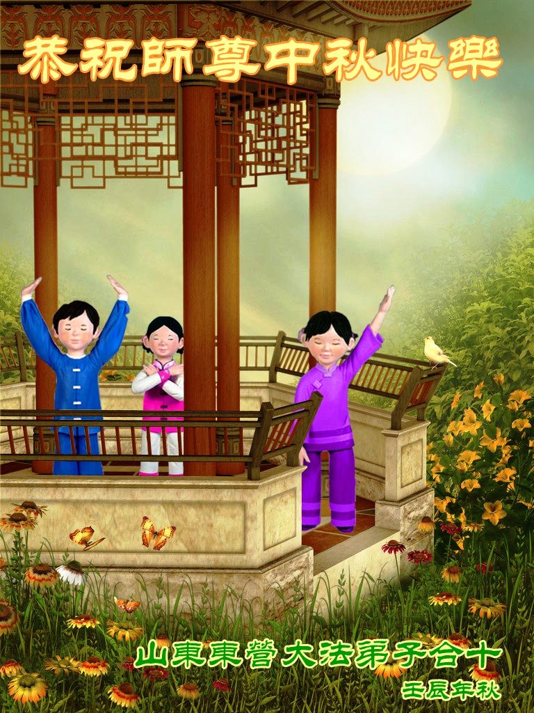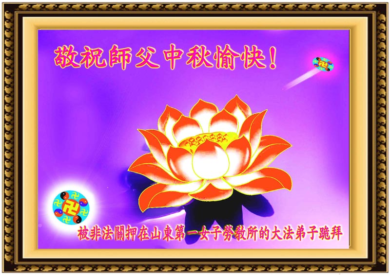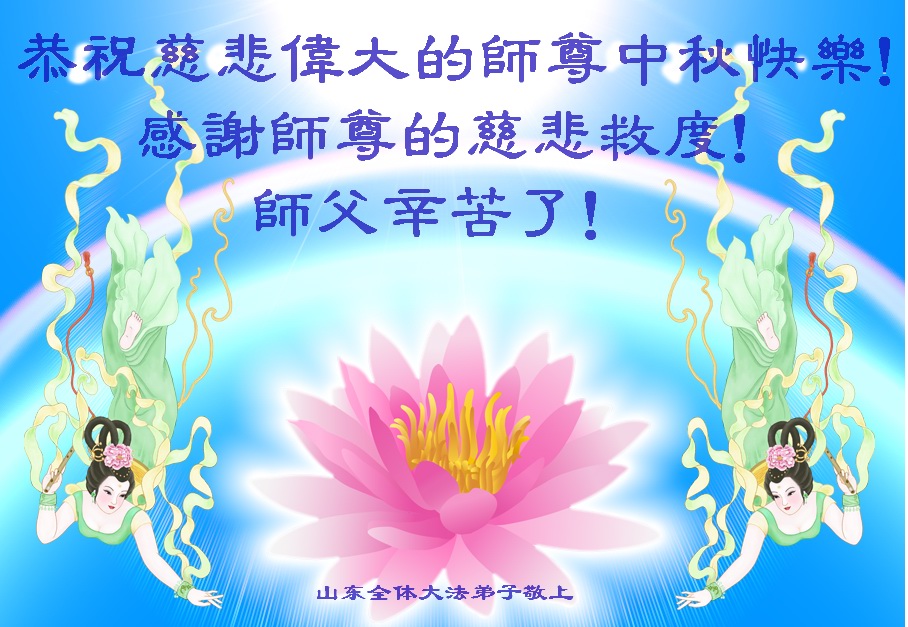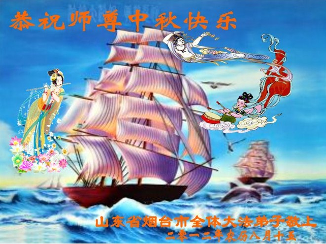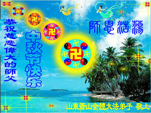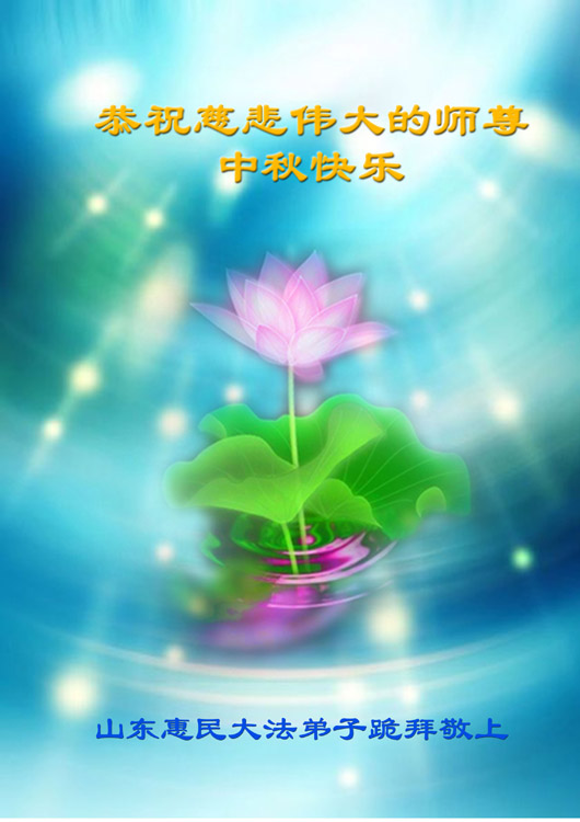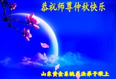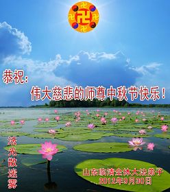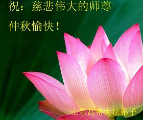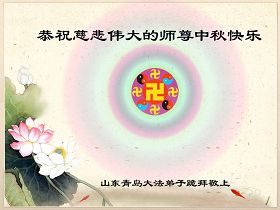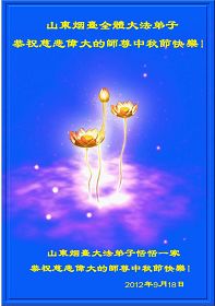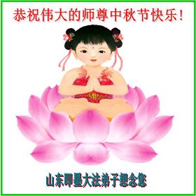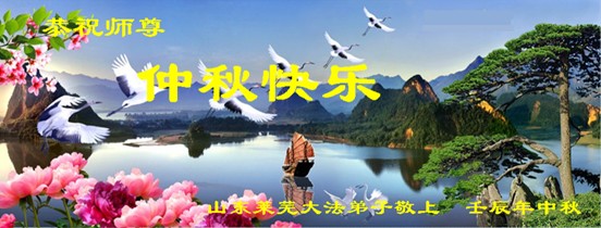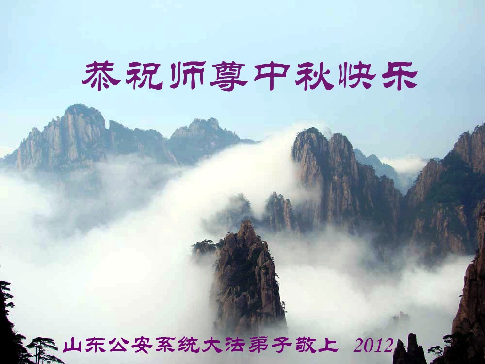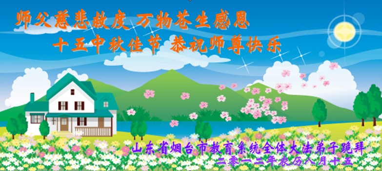 在二零一二年中秋佳节即将到来之际,山东出入境检验检疫系统全体大法弟子怀着无比崇敬的心情恭祝慈悲伟大的师尊中秋佳节快乐!我们一定不辜负师尊、大法和众生对我们的期望,努力做好三件事,越最后越精進,精進、精進、再精進,救度众生,助师正法,证实大法,圆满随师还!向师尊叩首!合十!