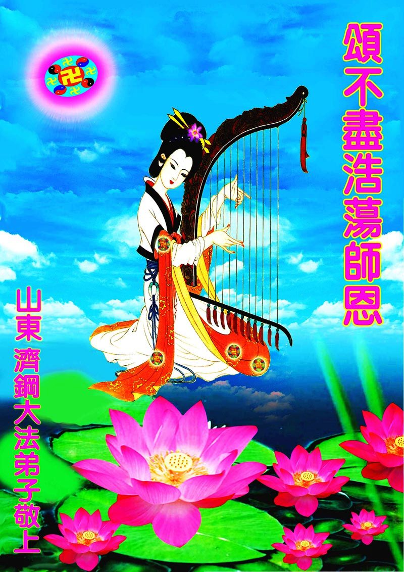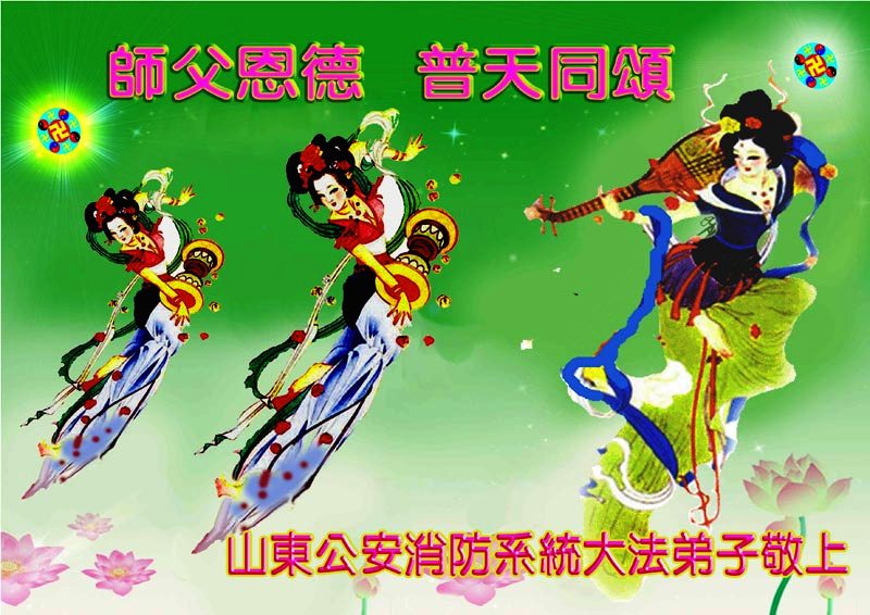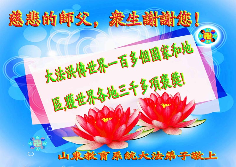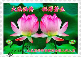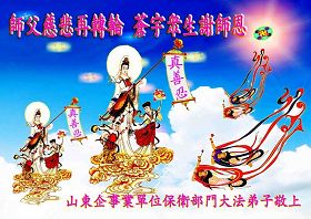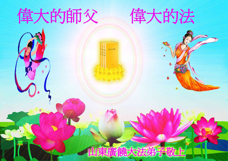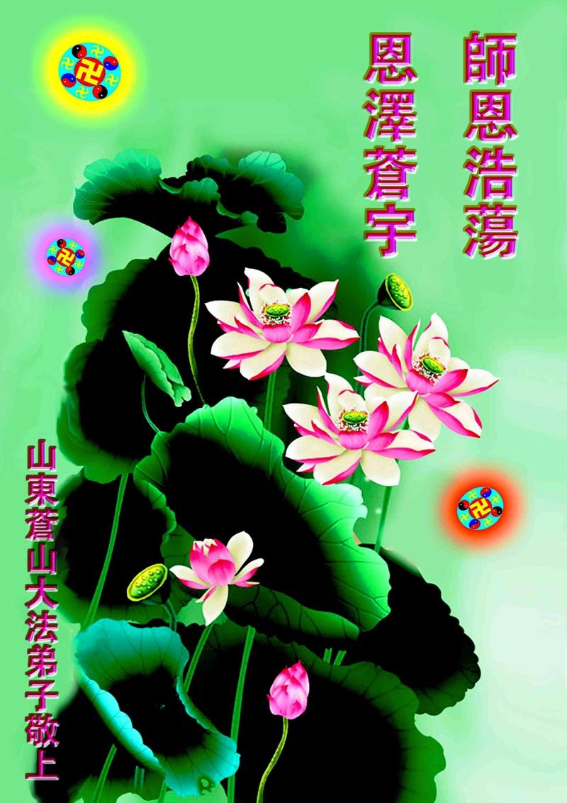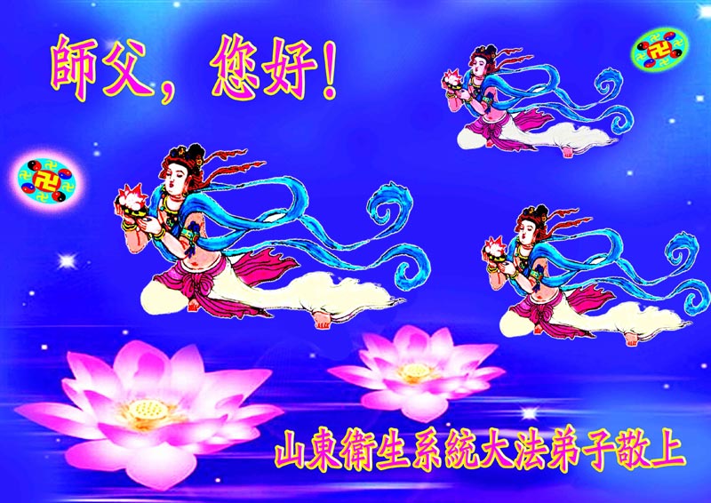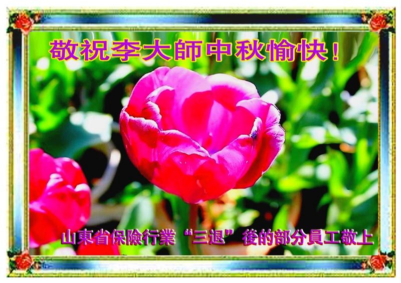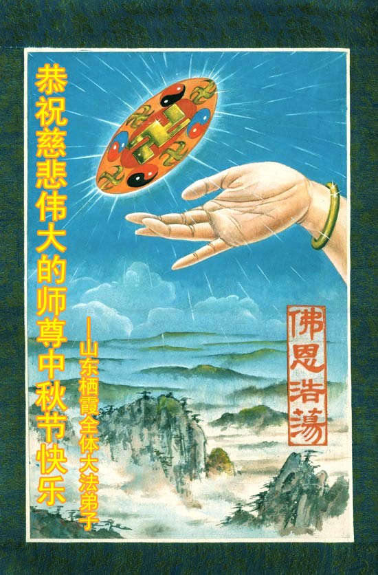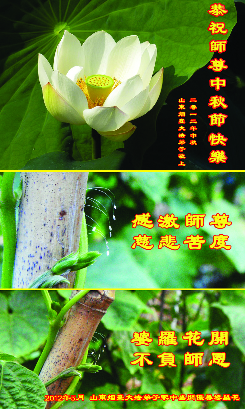 在二零一二年中秋佳节即将到来之际,山东出入境检验检疫系统全体大法弟子怀着无比崇敬的心情恭祝慈悲伟大的师尊中秋佳节快乐!我们一定不辜负师尊、大法和众生对我们的期望,努力做好三件事,越最后越精進,精進、精進、再精進,救度众生,助师正法,证实大法,圆满随师还!向师尊叩首!合十!