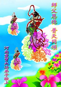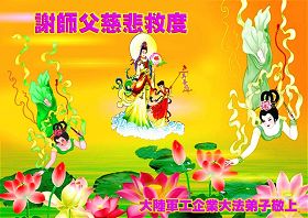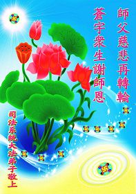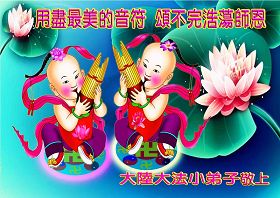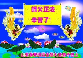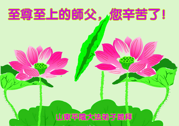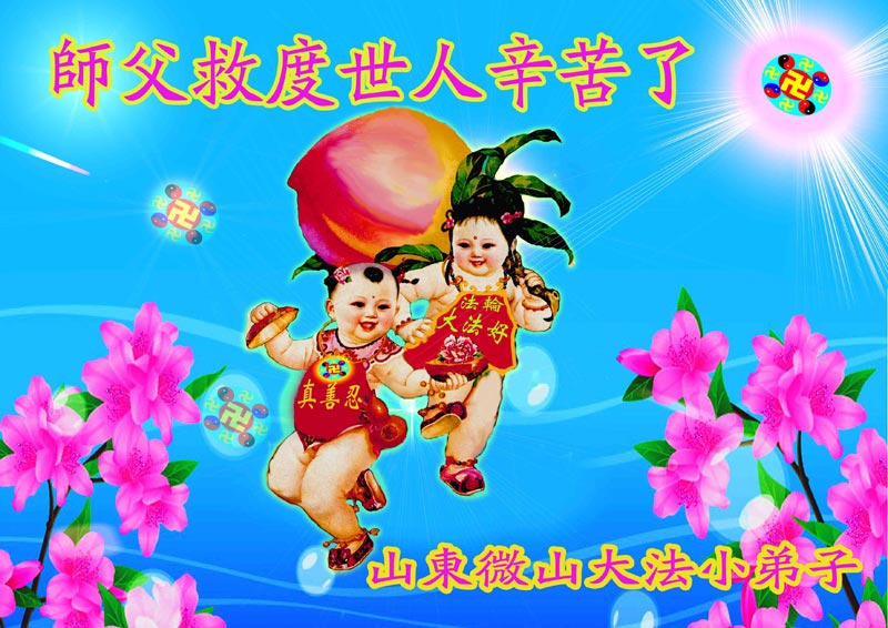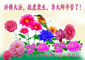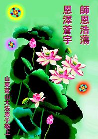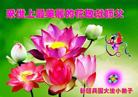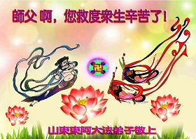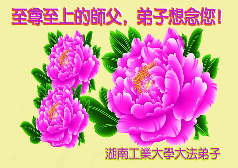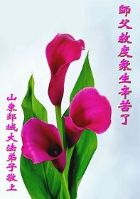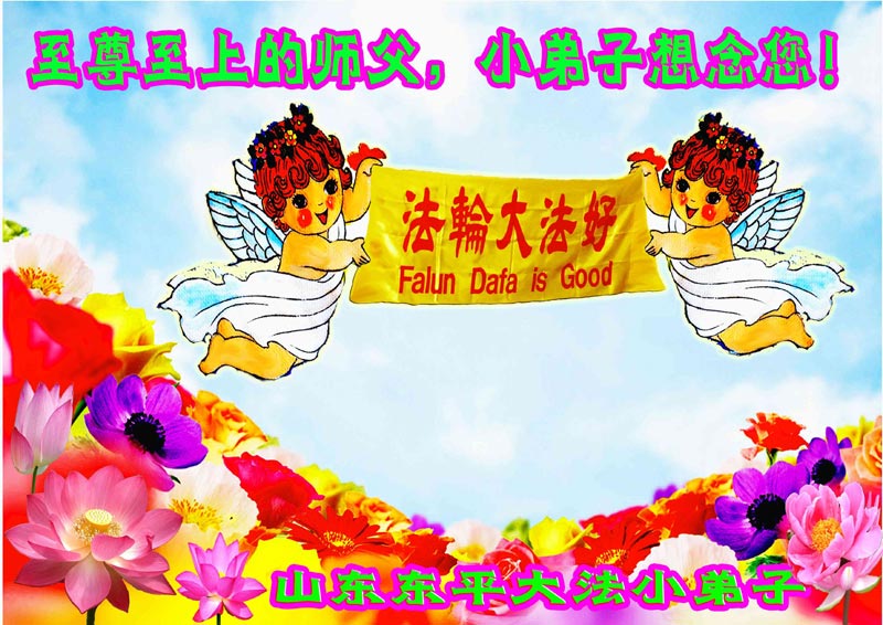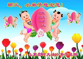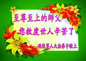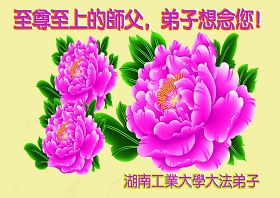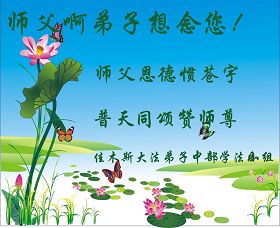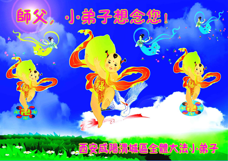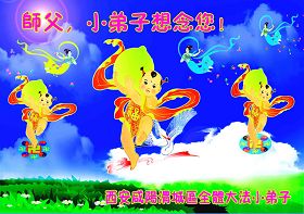 弟子们想念师父!请师尊放心,弟子一定修好自己,决不辜负师父慈悲救度,坚信大法,做好三件事。同时我家孩子及妻子都认同大法,平时也为大法做一些事情。早日盼师父归来、团聚!想念师父!