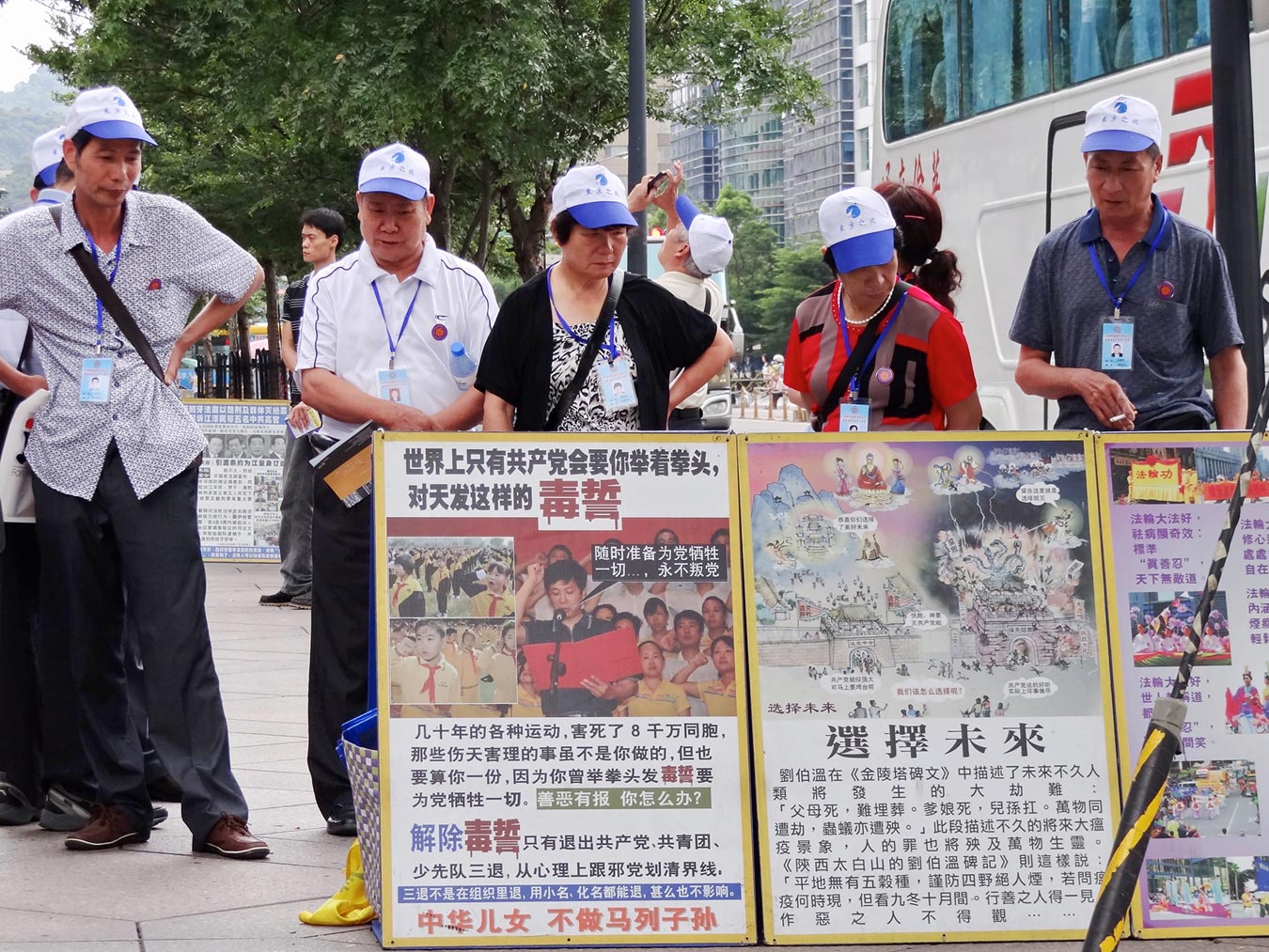 '日本导游正向他的团员解说展板上法轮功学员被中共迫害的事实真相'