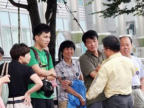 日本导游正向他的团员解说展板上法轮功学员被中共迫害的事实真相