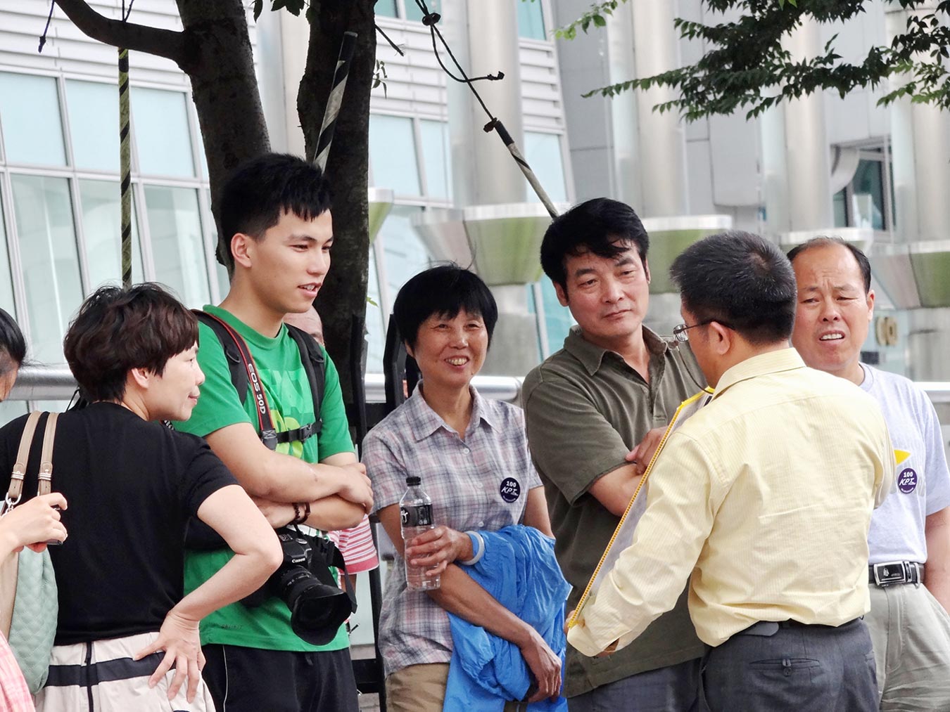 退休宜兰教师李光辉正向中国游客讲真相(身着黄色衬衫拿展板)