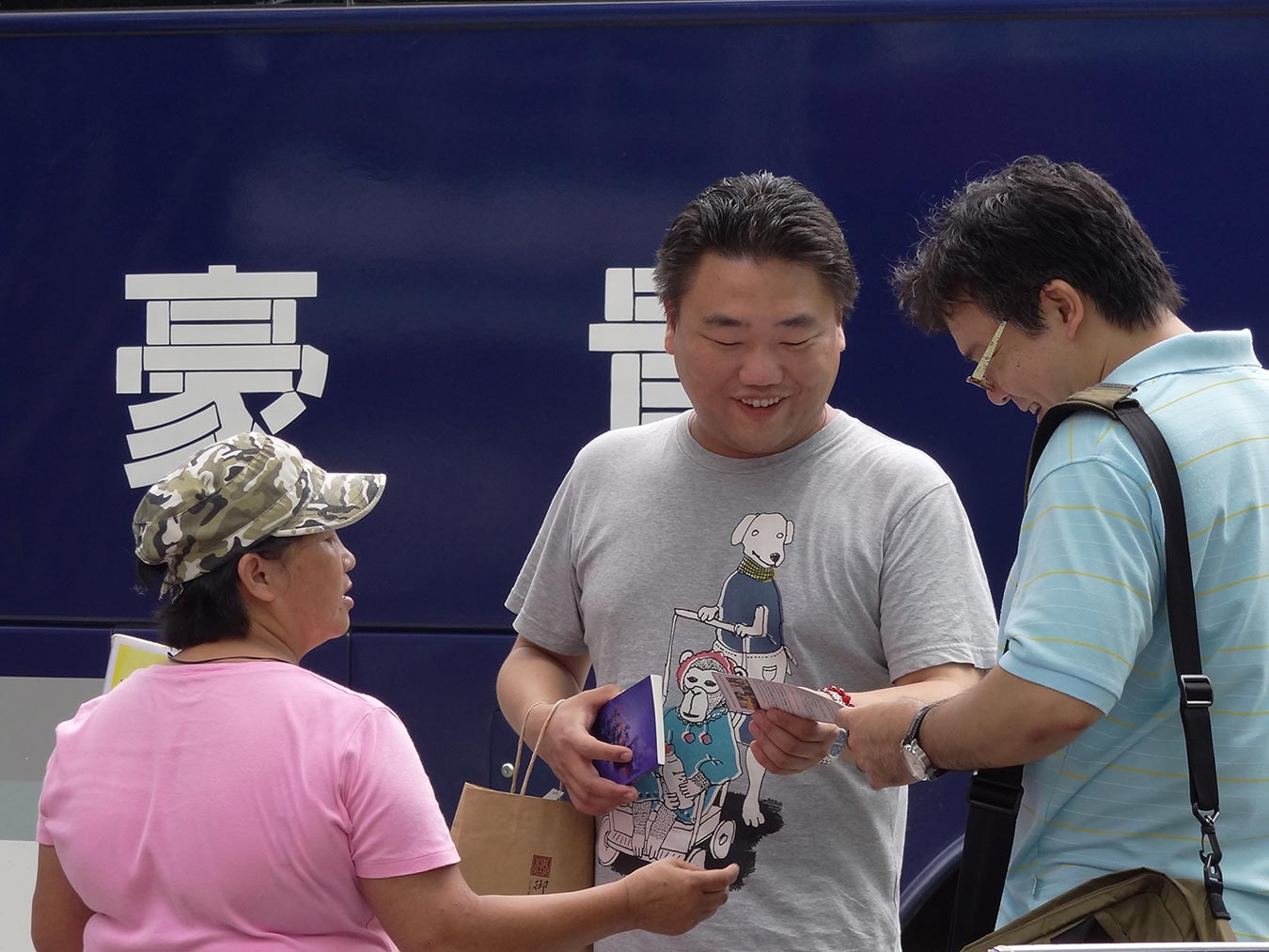 前边等车的游客驻足观看展板,日本导游手指着中共活摘法轮功学员器官、酷刑迫害一一地向他带的团员解释说明,那些游客个个额头紧绷,严肃地听着导游讲解,当看到贵州平塘藏字石的门票图片上“中国共产党亡”六个字,尤其“亡”字还更大时才露出微笑。