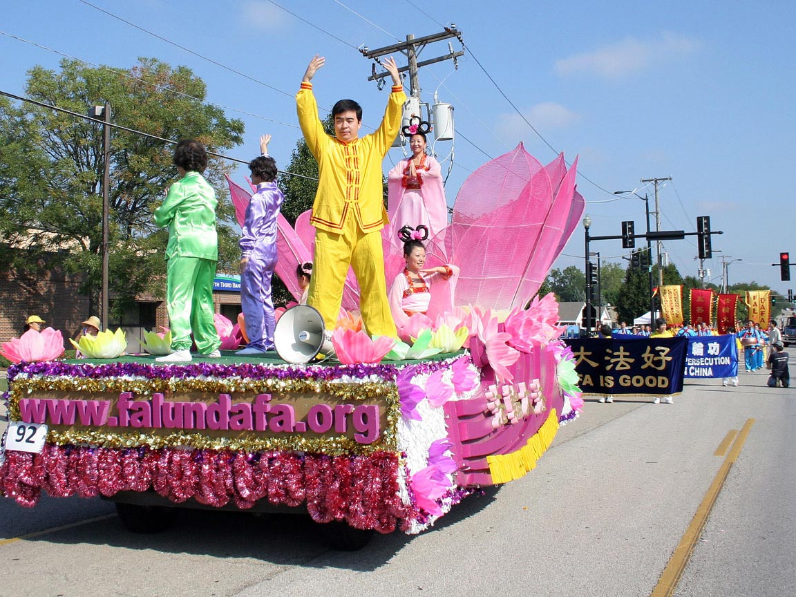 ![]() 法轮功队伍精美的莲花花车引人瞩目 |