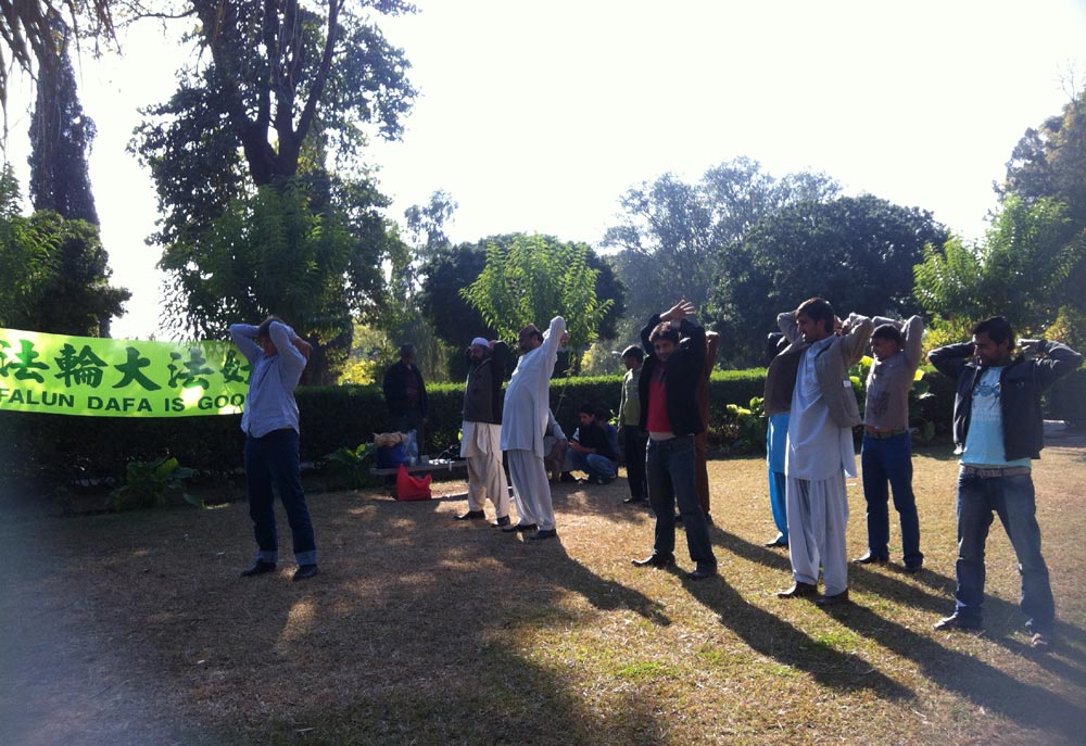 ![]() 在巴基斯坦公园里介绍法轮功 |