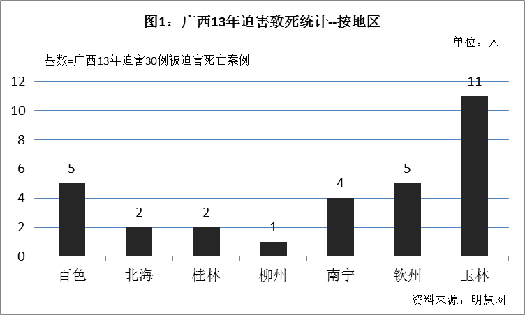 ![]() 图1统计结果显示,广西30例死亡案例中,玉林最多,有11人被迫害致死,其次钦州、百色各5例,南宁4例,北海2例。林铁梅是玉林11例死亡案例中的其中1例。 |