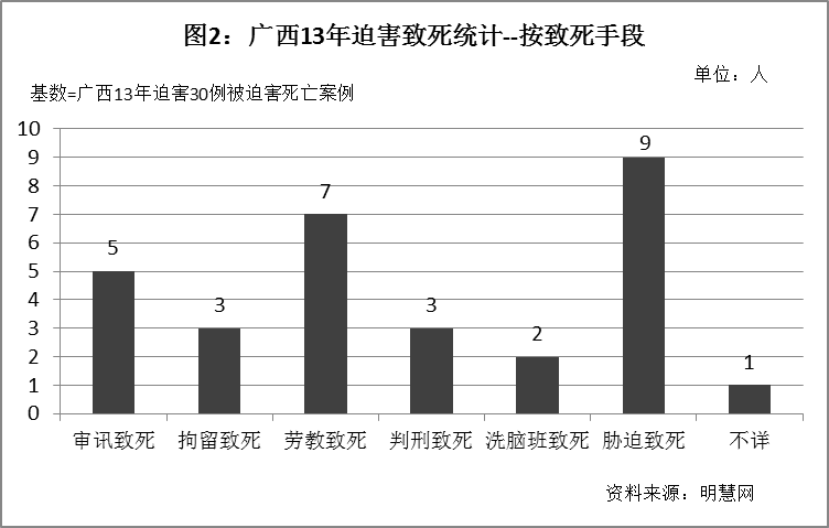 ![]() 图2统计结果显示,在这些被迫害致死案例中,因为胁迫致死(如失去学法炼功环境、持续受到威胁而导致身心被摧残等)有9例,劳教致死7例,审讯致死5例、判刑致死和拘留致死各3例,洗脑班致死2例。 |