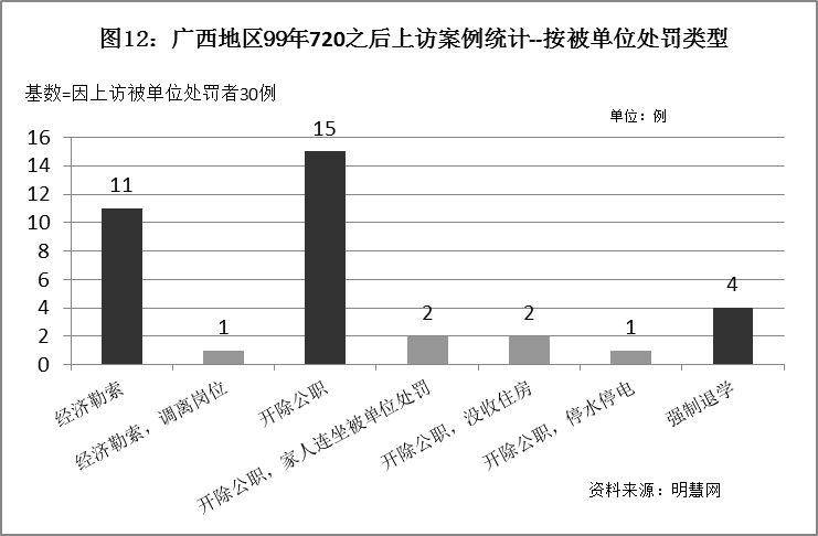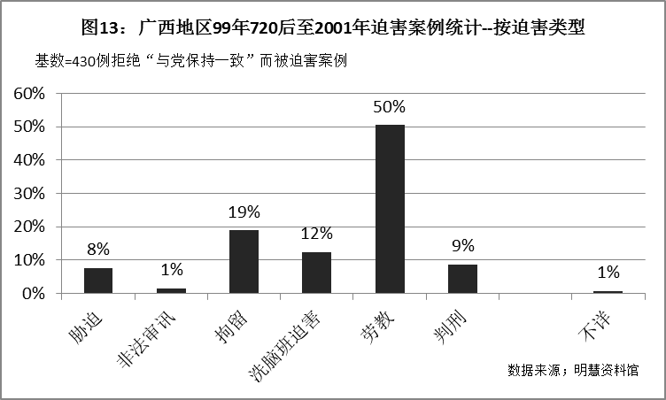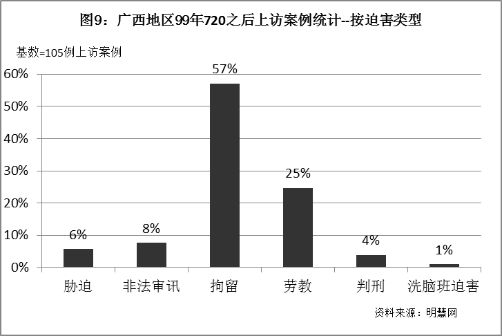 ![]() 图9统计结果表明,上访的广西法轮功学员中,有57%受到拘留处罚,25%受到劳教处罚,8%遭到非法审讯,6%被中共当局胁迫,4%被判刑,1%被洗脑班迫害。 |