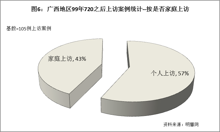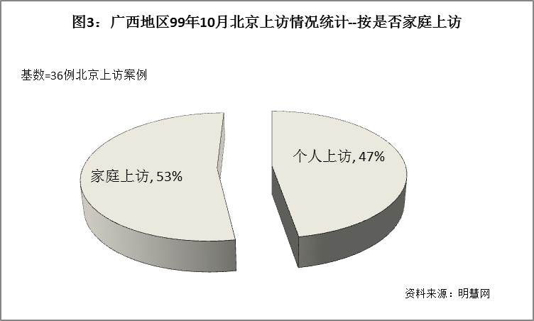 ![]() 图3结果显示,99年10月左右到北京上访的广西法轮功学员中,属于“家庭上访”(也就是一家有好几口同时去上访的)占53%。这些家庭因为都是全家多人炼法轮功,于是就全家多人一起到北京上访。 |