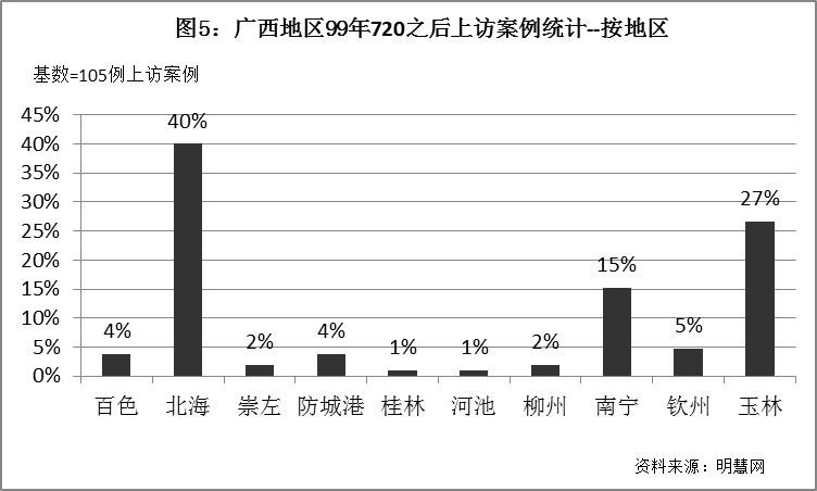 ![]() 图5统计结果表明,迫害13年来,广西地区除贵港、来宾、贺州、梧州外,其它10个地区都被记录到有法轮功学员上访。其中,北海地区最多,占40%,其次玉林,占27%,南宁15%。 |
