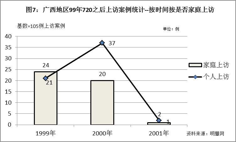 ![]() 图7结果显示,“个人上访”数量在1999年低于“家庭上访”数量,但到2000年,“个人上访”则大幅上升,说明越来越多的法轮功学员正在作为一个独立的个体、基于个人意愿,以个人行为的方式投入到善意讲真相、揭露中共迫害谎言的洪流中。 |