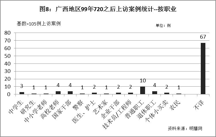 ![]() 图8结果显示,参加上访的法轮功学员来自于各行各业各工种,有国家干部、企业干部,也有个体户,有普通职工、退休工人还有农民,有学生也有高校老师和中小学老师,也有艺术家、技术员/工程师,甚至还有警察,可以说是各行各业各工种都有人到北京上访。这说明中共迫害的不是一小部份人,不是某个特定行业,而是所有行业、整个社会。 |