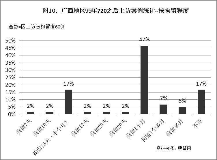 ![]() 图10统计结果表明,因为上访而被拘留的法轮功学员中,受到一个月拘留迫害的案例最多,占47%,其次是拘留15天(半个月),占17%。 |
