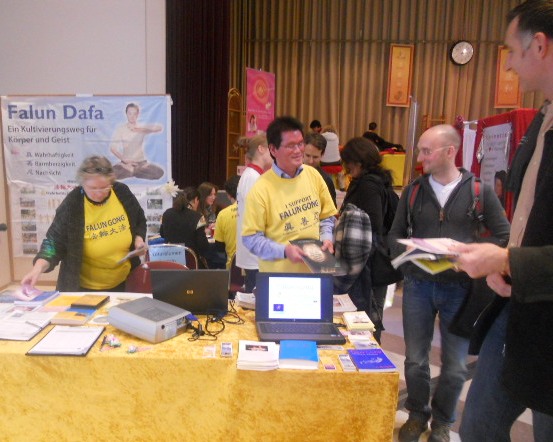 【明慧网二零一三年一月二十一日】二零一三年一月十八日至二十日,德国法轮功学员参加了在曼海姆市(Mannheim)的莱茵金色展览馆(Rheingoldhalle) 举办的展览会,向当地居民介绍了来自中国的佛家修炼大法——法轮大法。