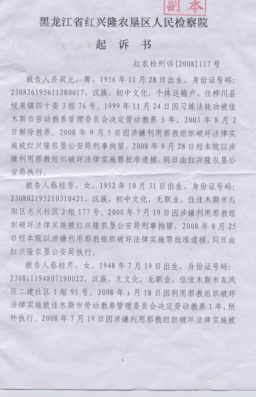 红兴隆农垦检察院以“利用×教组织破坏法律实施罪”向黑龙江省农垦红兴隆法院提起“公诉”,二零零八年十一月二十一日,农垦红兴隆法院公开对蔡家三姐妹、司机、刘景燕(当时已七十岁)等七名法轮功学员非法开庭。在庭上,七人均申明:“法轮功不是邪教,法轮大法好,真善忍好,信仰无罪。”当七人进一步证实法轮功祛病健身、使人道德回升时,审判长刘丹强行阻止。
