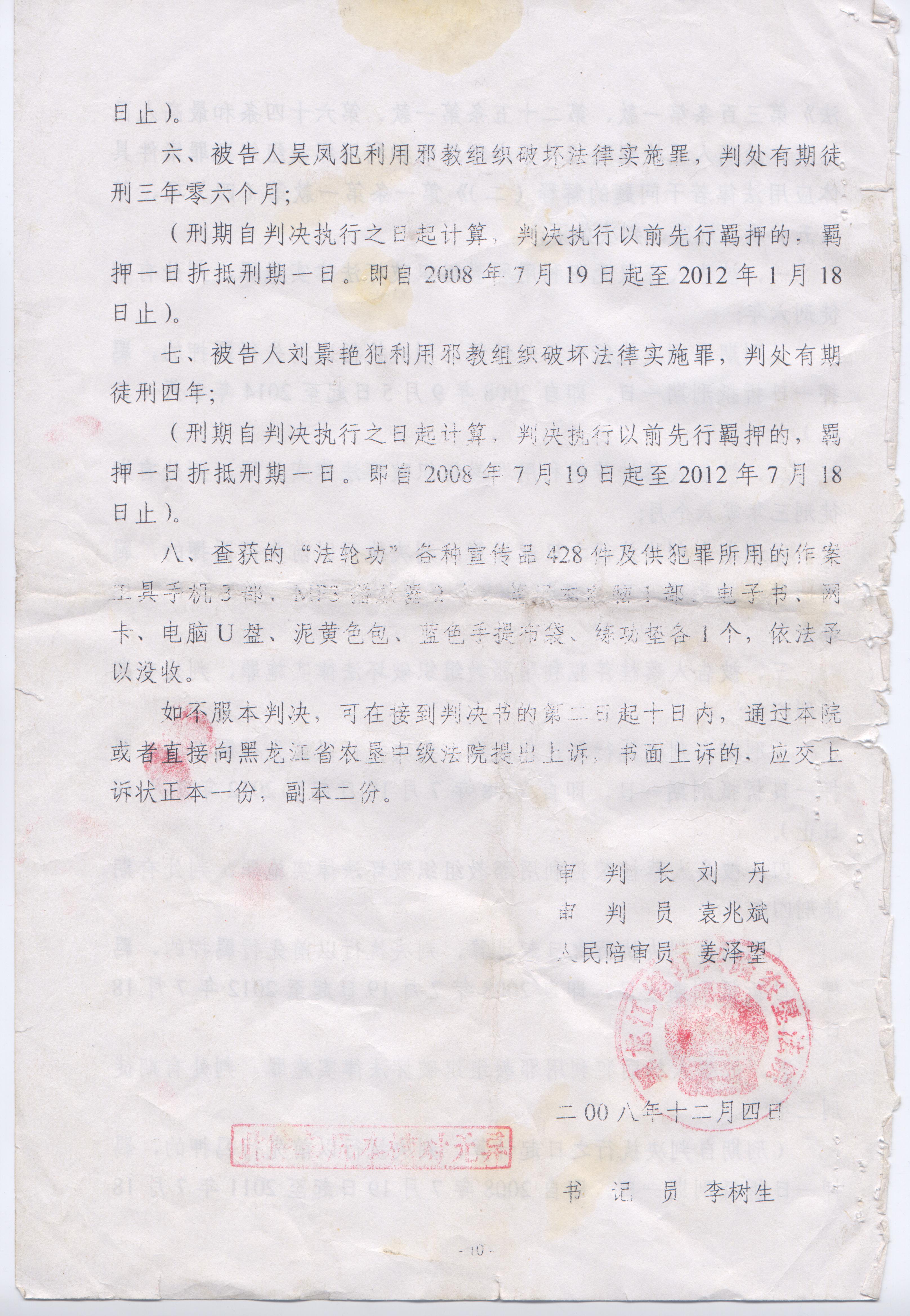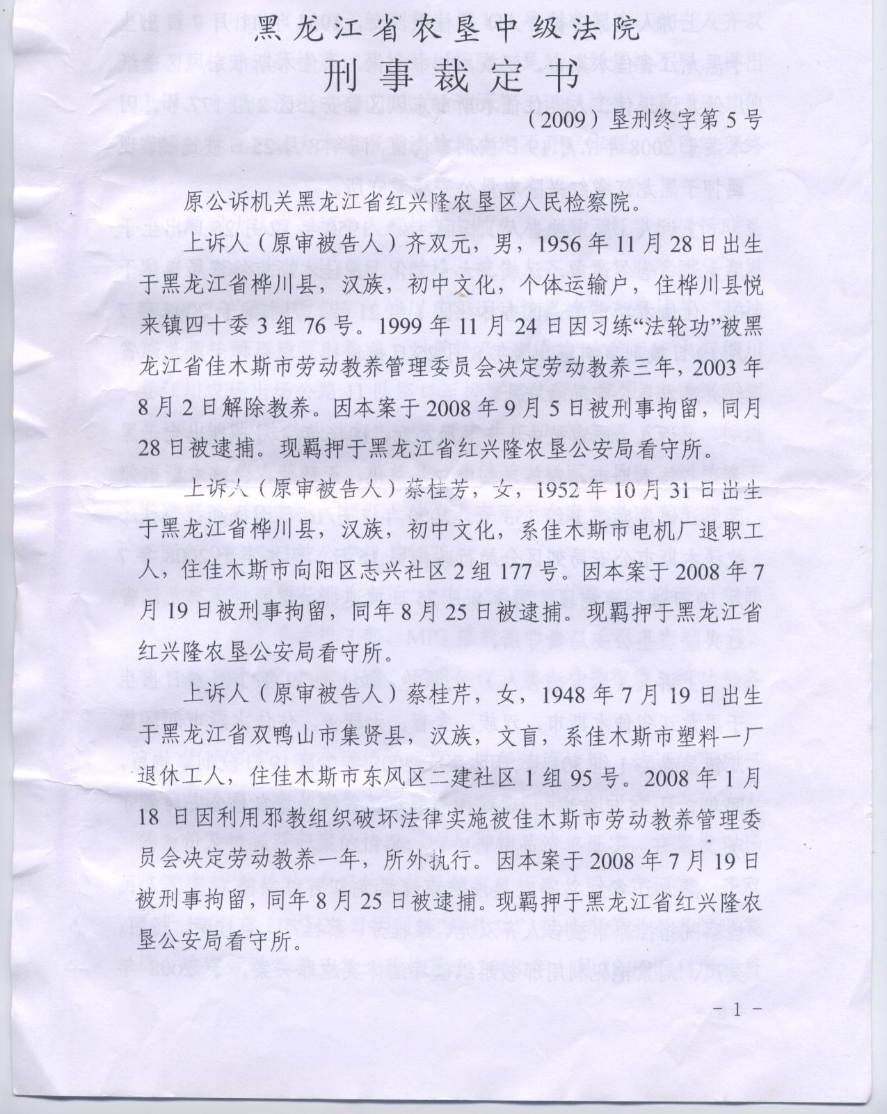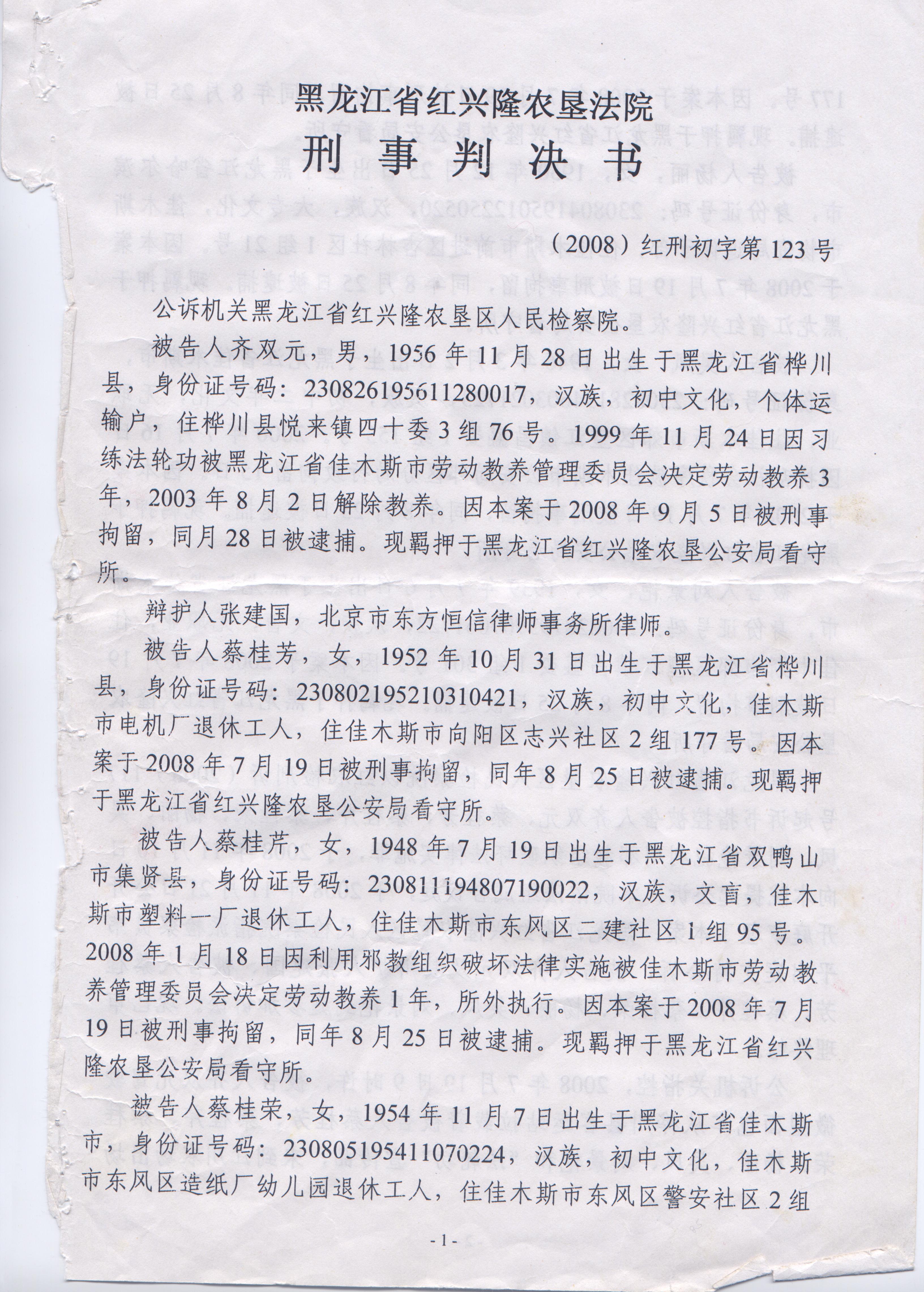 二零零八年十二月四日,农垦红兴隆法院仍然以莫须有的罪名,枉判大姐蔡桂芹和三妹蔡桂荣四年、二姐蔡桂芳三年半,司机六年,七旬老妇刘景燕也不放过,被诬判四年。