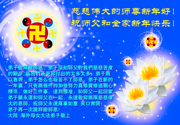 慈悲伟大的师尊好!师尊辛苦了!在此我们恭祝师尊新年好!弟子想念师尊,向慈悲伟大的师尊叩首拜谢!师恩浩荡难以报,唯有精進添正念。放下自我多救人,助师正法了洪愿。待到邪恶除尽时,法徒圆满迎师还。
