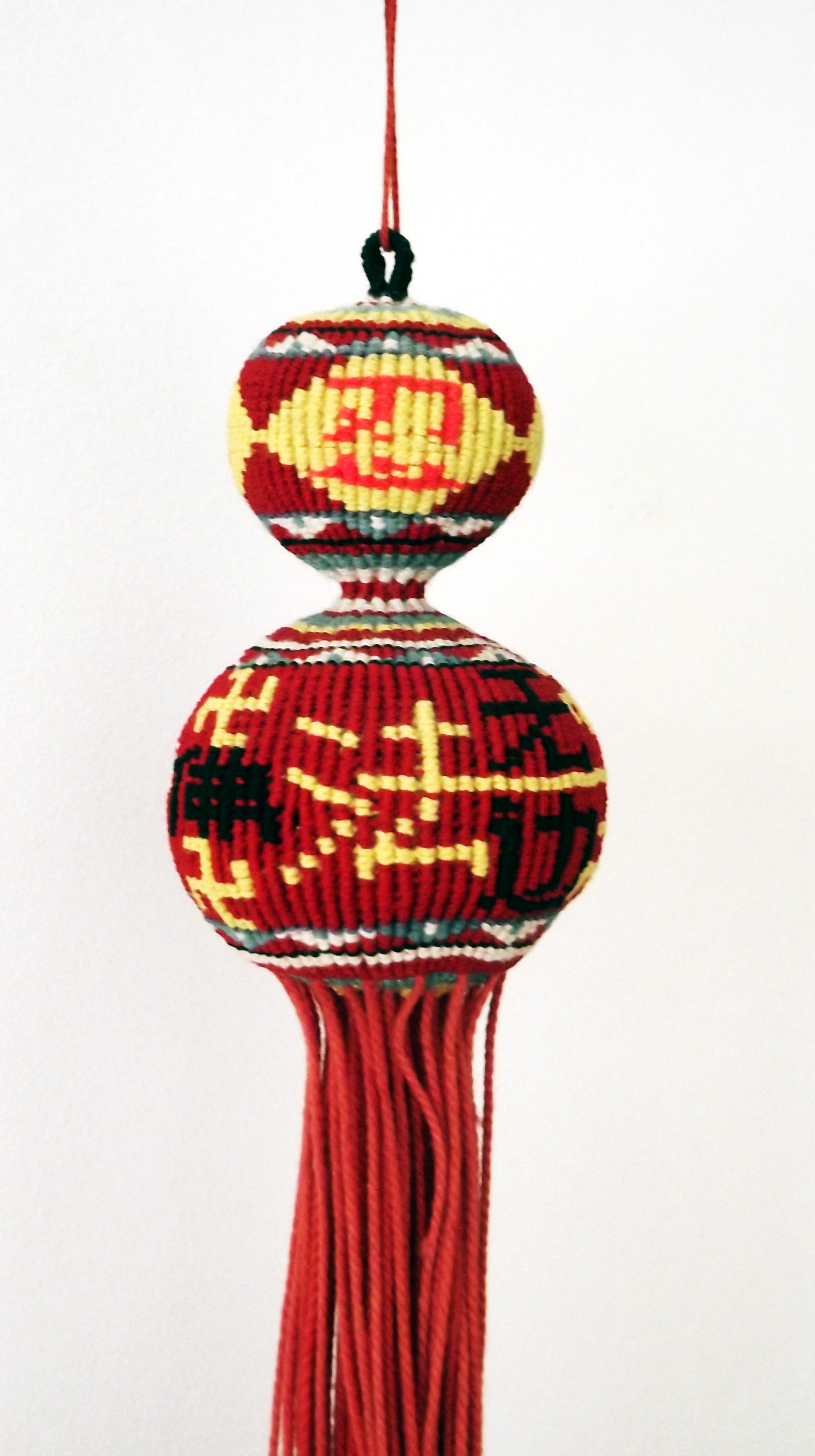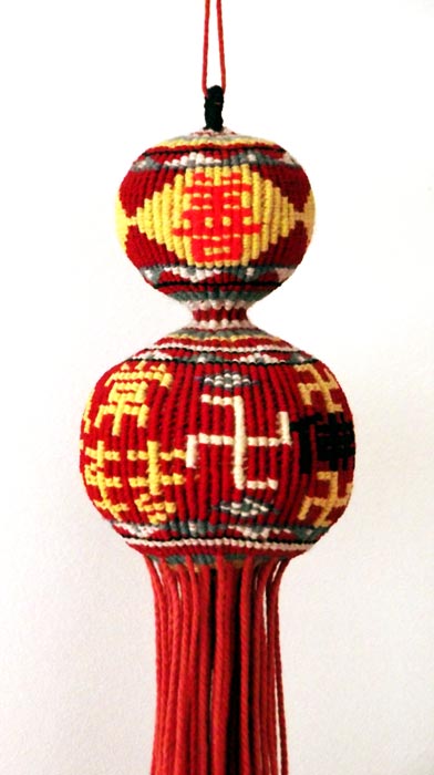 【明慧网二零一三年一月三十日】该工艺品是手工编制的葫芦,是二零零零年冬季大陆一看守所内明白大法真相的在押常人,背着管教利用一个星期的时间为同监号大法弟子编制的。编制葫芦用的材料,是从监号里新的红色线裤上拆下的线,然后再搓成的线绳。葫芦上面编有“真、善、忍”三个字,葫芦的下面利用公用字精心设计了“法轮常转 佛法无边”几个字和几个卍字符,甚是巧妙。