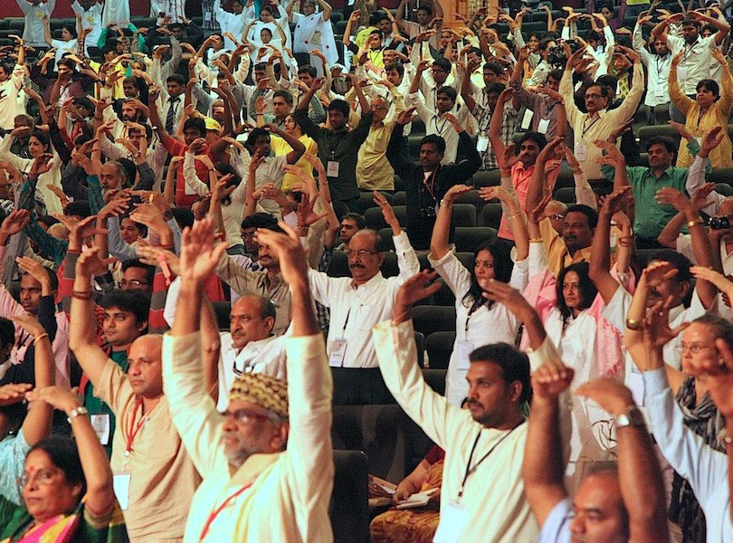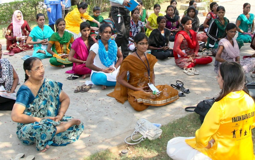 印度法轮功学员向群众介绍法轮大法(又称法轮功)是佛家上乘修炼大法,以宇宙最高特性“真善忍”为根本指导,有五套简单易学的功法,在把真正修炼的人带到高层次的同时,对稳定社会、提高人们的身体素质和道德水准,也起到了不可估量的正面作用。学员还用英语、中文向大家说“法轮大法好”,大家也用英语和学用中文喊“法轮大法好”。学员在会议中讲述大法的美好与法轮功在中国大陆无辜遭受迫害的真相,有人当场合十致意。当学员说到“这不只是中国大陆的事,全世界都应为人权而站出来”时,与会的所有宾客全部起立,表达支持人权反迫害,并站立许久才坐下。