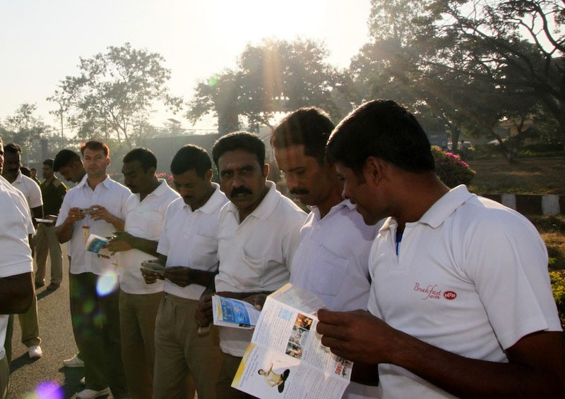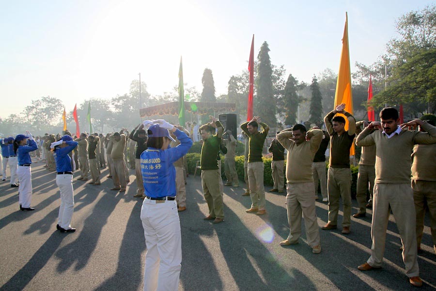 印度警察们学习法轮功功法,并认真阅读真相传单。