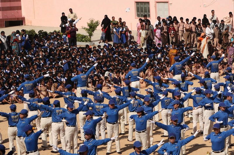 天国乐团十八日抵达海得拉巴市的卓越学校(School of Excellence)表演,这是一所从幼儿园到高中的贵族学校。全校师生聚集在广场,学生也用梵语念颂一段感谢神的词语和热烈鼓掌表达欢迎。
