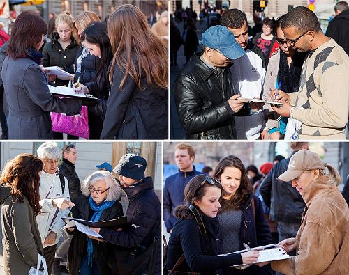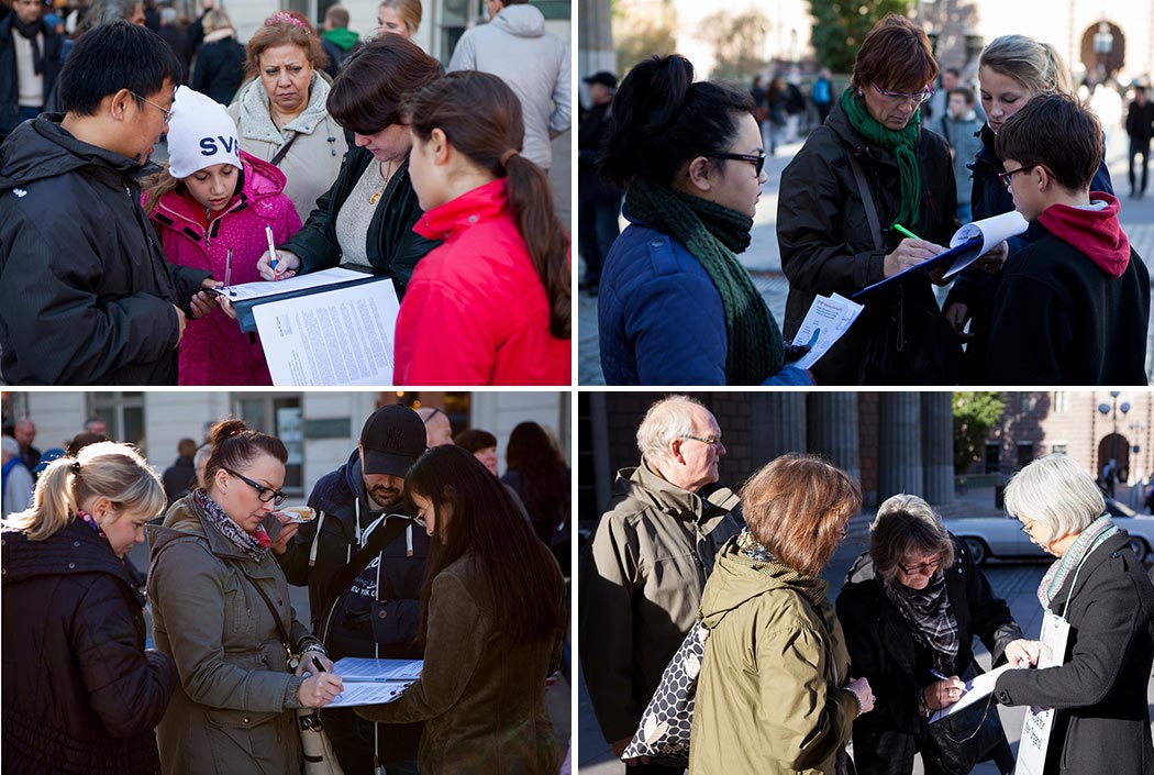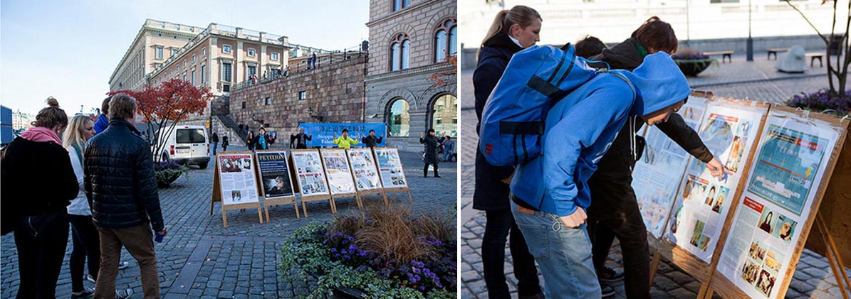 【明慧网二零一三年十月十三日】二零一三年十月十二日,瑞典法轮功学员在首都斯德哥尔摩最热闹的皇宫旁的Mynttorget广场举办“制止中共活摘器官”征签活动。广场上悬挂着“停止迫害法轮功”醒目的横幅,整齐的真相展板向民众揭露着中共迫害法轮功学员的残暴;同时,优美的炼功音乐,舒缓、祥和的法轮功功法展示,吸引着来自各地游客及当地民众驻足观看。当人们了解到法轮功学员修炼“真、善、忍”,却被中共残酷迫害,以及大规模活体摘取法轮功学员器官时,非常震惊,纷纷在制止中共迫害法轮功的征签簿上签名。
