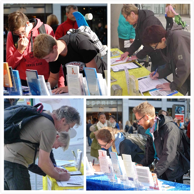【明慧网二零一三年十月二日】(明慧记者雪莉报道)由医生反对活摘器官协会(DAFOH)发起的征集签名活动,正在北德各城市展开。二零一三年九月份的每个周六下午,德国北部的汉堡、汉诺威、不来梅和希尔德斯海姆的部份法轮功学员在市中心展示法轮功五套功法,讲真相,设立模拟“手术台”,揭露中共强制活体摘取法轮功学员器官贩卖牟利的暴行,并以征签方式呼吁各界共同制止这种罪恶。
