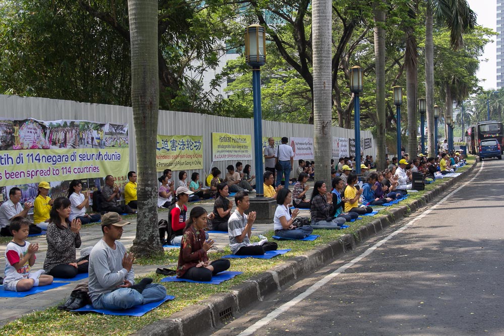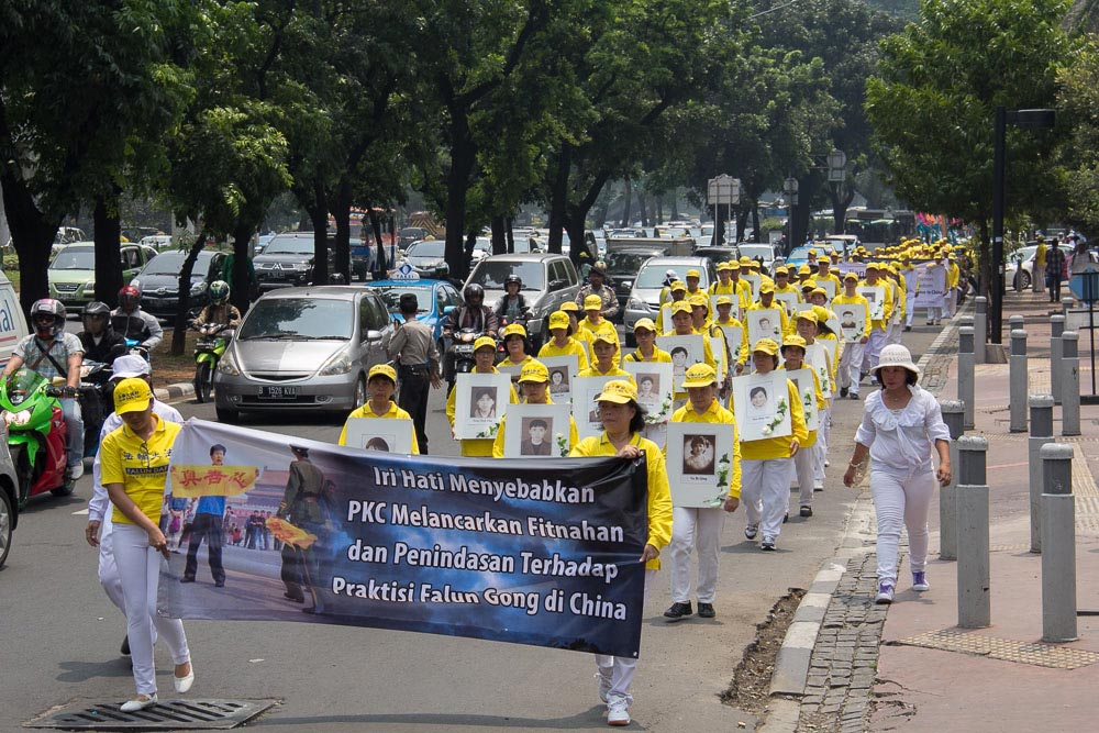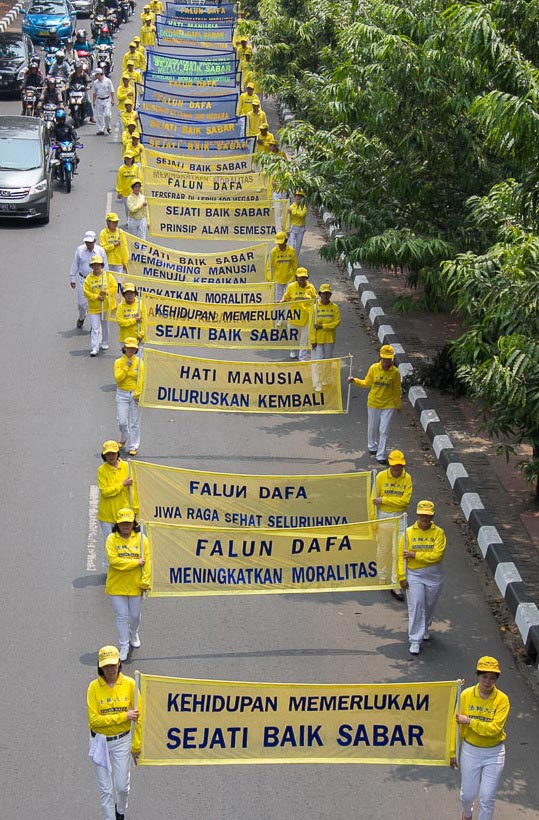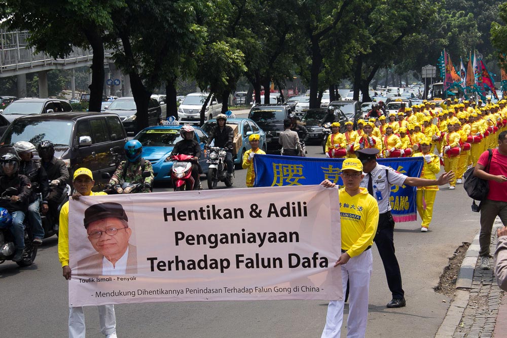 第二天,数百名法轮功学员来到雅加达繁华的市中心开始游行,沿途展示法轮大法的美好,揭露中共对法轮功长达十四年多的迫害。游行队伍的先导是天国乐团,他们的演奏吸引了众多路人的目光。印尼的人权组织也制作了横幅表示支持,其中一个横幅是印尼著名诗人陶菲克·伊斯梅尔(Taufik Ismail)对法轮功表达的支持:“停止迫害法轮大法,将恶人绳之以法。”游行过程中,数千张真相传单发到了路人手中。