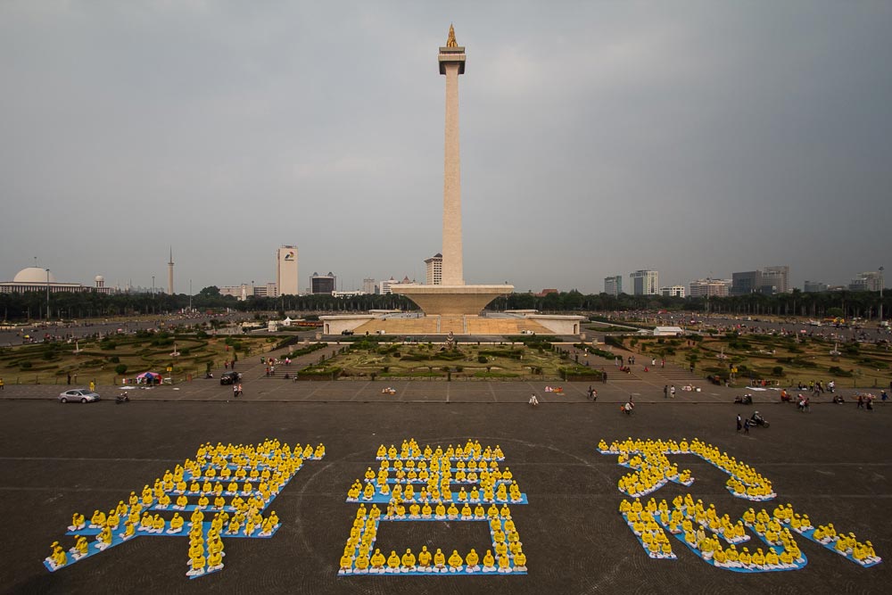 游行结束后,学员们来到雅加达的主要旅游景点——国家博物馆的西侧,集体排字:“真善忍”。许多游客被这不寻常的景象吸引,纷纷聚拢过来,学员们则一边散发真相资料,一边与游客交谈。