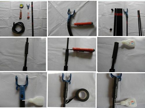 需要准备的材料:如图所示绝缘防水胶带,切割小刀,502胶水,厚壁胶皮管,挑衣杆前端的插头,短节钓鱼竿。