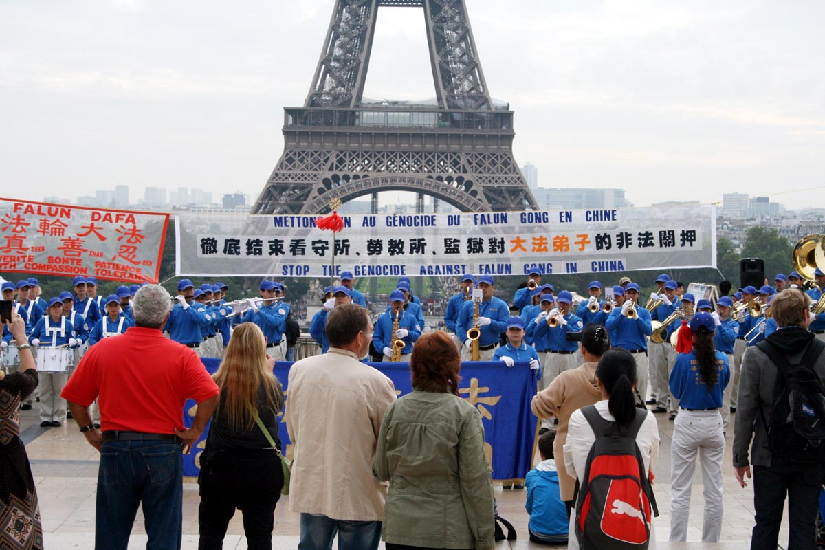 【明慧网二零一三年十月九日】二零一三年十月六日,来自欧洲八个国家的部份法轮功学员,汇聚在巴黎的埃菲尔铁塔正对面的人权广场(place du Trocadéro)上,在主持人英语和法语的介绍中,演示法轮功功法,展示法轮大法的美好。同时,医生反对活摘器官协会(DAFOH)的代表向来自世界各地的游客讲述中共活体摘取法轮功学员器官的事实。了解真相的人们纷纷表示支持法轮功学员反迫害
