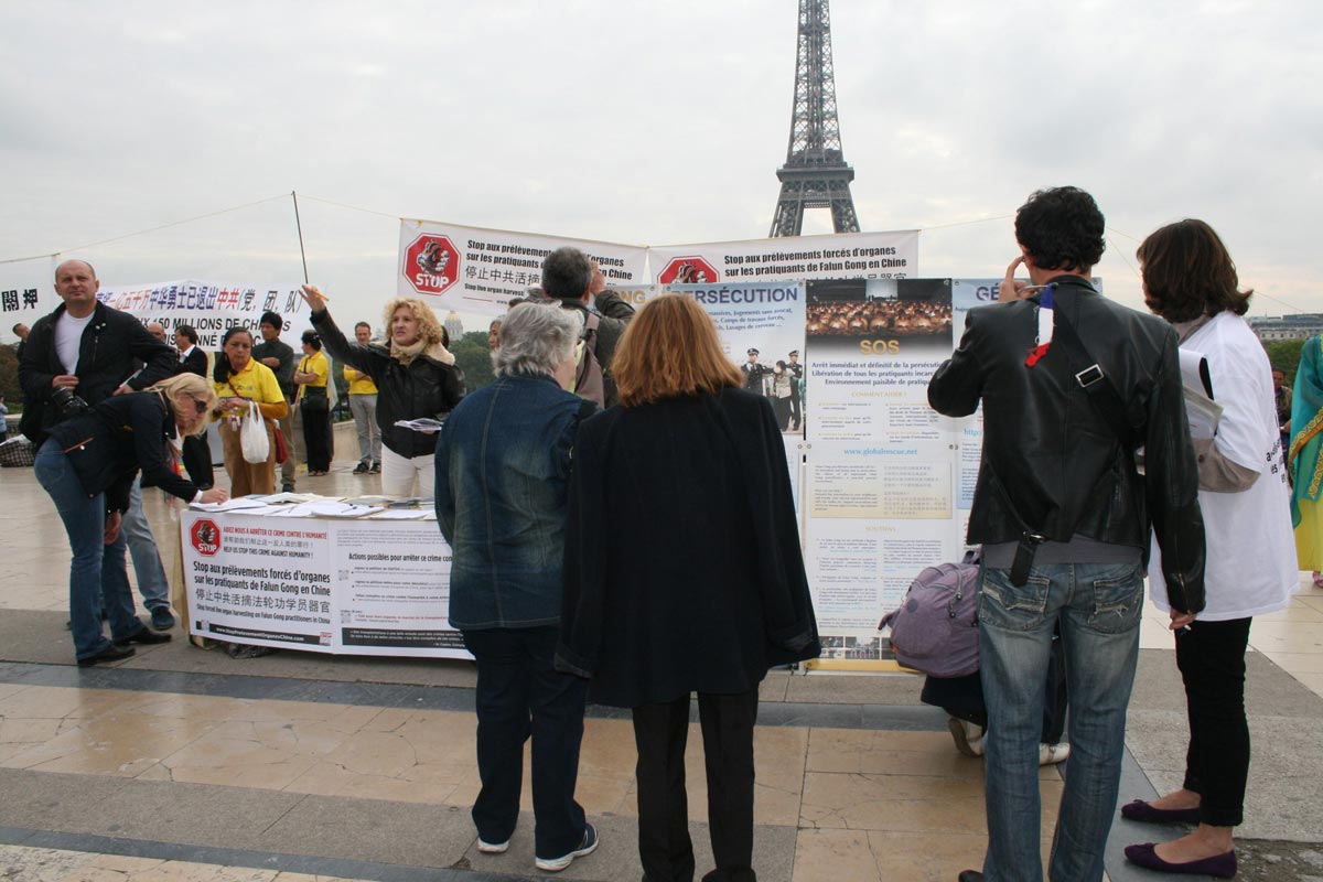 空中以铁塔为背景的法、中、英三种文字的横幅“停止活摘法轮功学员的器官”,“彻底结束看守所、劳教所、监狱对大法弟子的非法关押”赫然眼前。当看到揭露迫害真相的展板,人们震惊了;了解真相的游客主动在反对中共活摘器官的征签簿上签名。