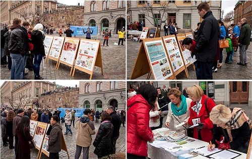 一位瑞典男士,认真听学员讲述法轮功真相,当听到中共活摘法轮功学员器官时,他落泪了,实在是听不下去了,他很伤心,很愤慨,用颤抖的手签了字,擦着泪水离开了。