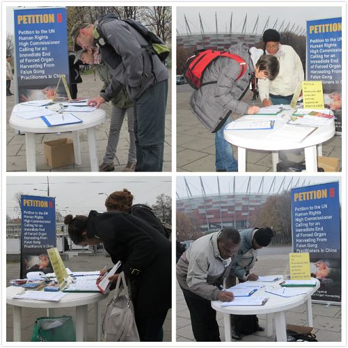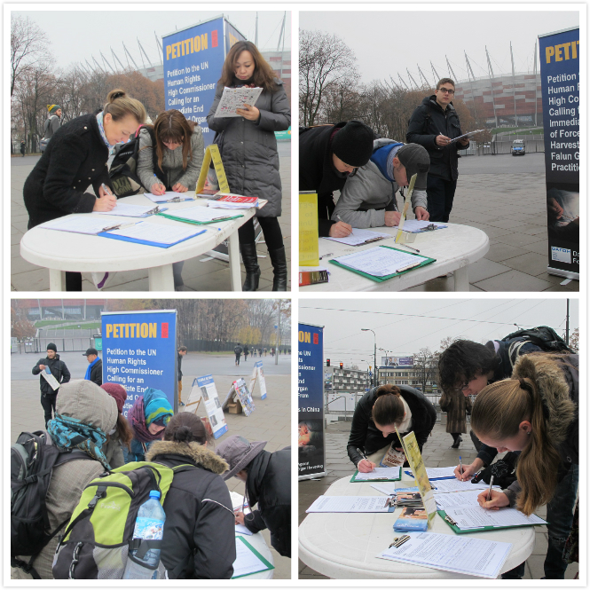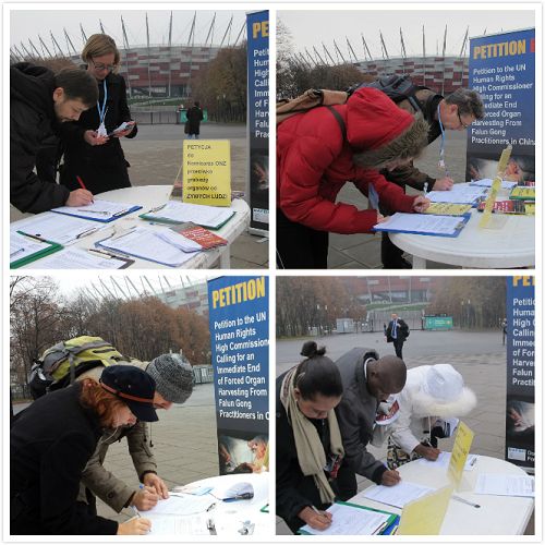 四天内,波兰法轮功学员共收到一百零二个国家及欧盟机构,近八百名各国代表的签名,要求联合国独立调查活体摘除法轮功学员器官的罪行,代表们共同表达一个声音:活摘器官已超出人类道德底线,迫害修炼人天理难容!