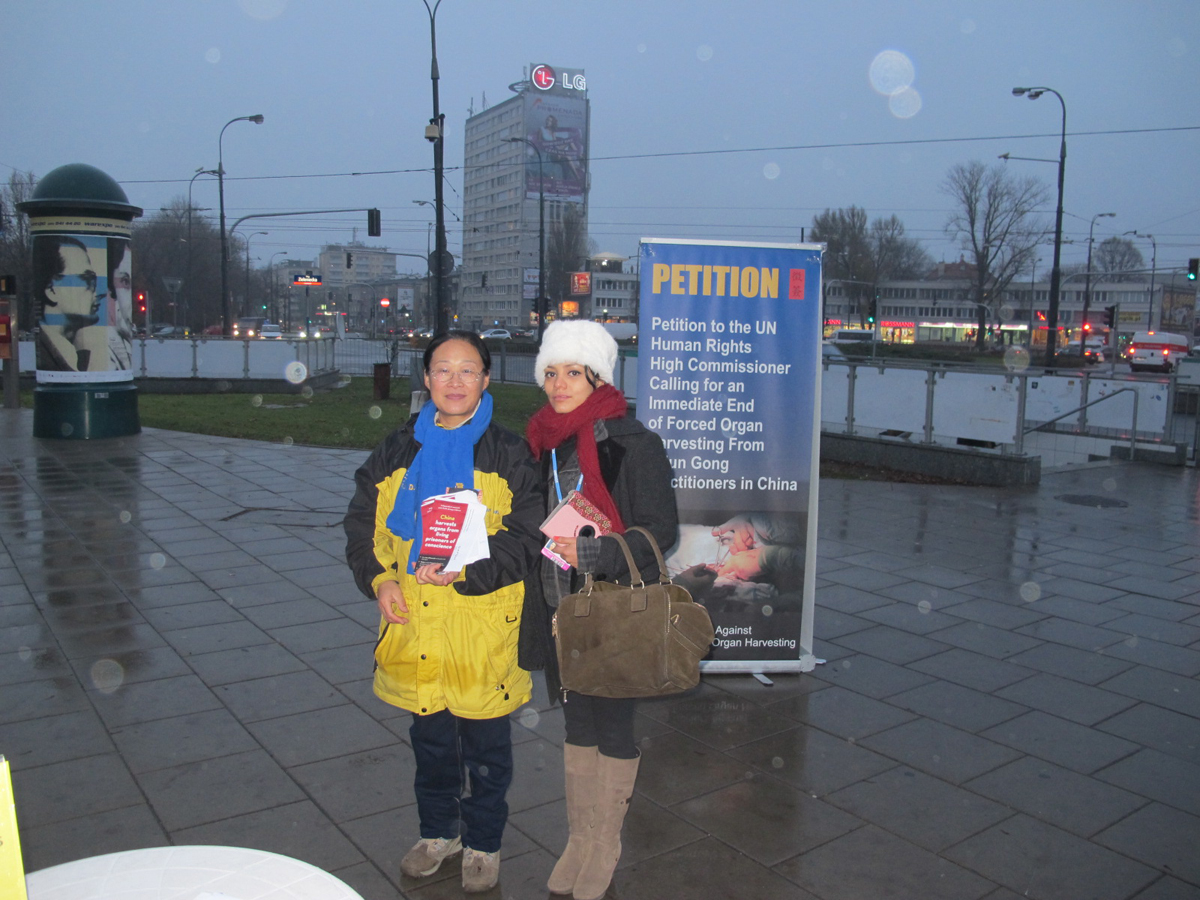 十一月二十二日晚,一对年轻的夫妇来到征签台要求参加征签,随后不顾天气的阴冷和潮湿,与法轮功学员交谈了有一个多小时。他们说:“我们来自墨西哥玛雅地区,我们那里一直有传说一九九二年到二零一二年,会有神来拯救地球,人类将进入新纪元。我们一直都在苦苦等待寻找,可是马上就二零一四年了,还是没有找到,心中总是忐忑不安。这次来波兰,我们都听到了法轮大法音乐,看到你们从早到晚为真理坚持着,如今在世界上已很少见到你们这样的人了,我们真的很感动,我们想多了解一下法轮大法,能为我们多介绍一些吗?”