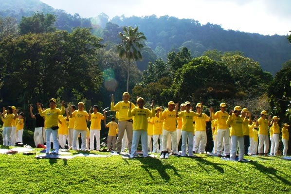 '部份法轮功学员在槟城著名旅游景点植物公园集体炼功。'