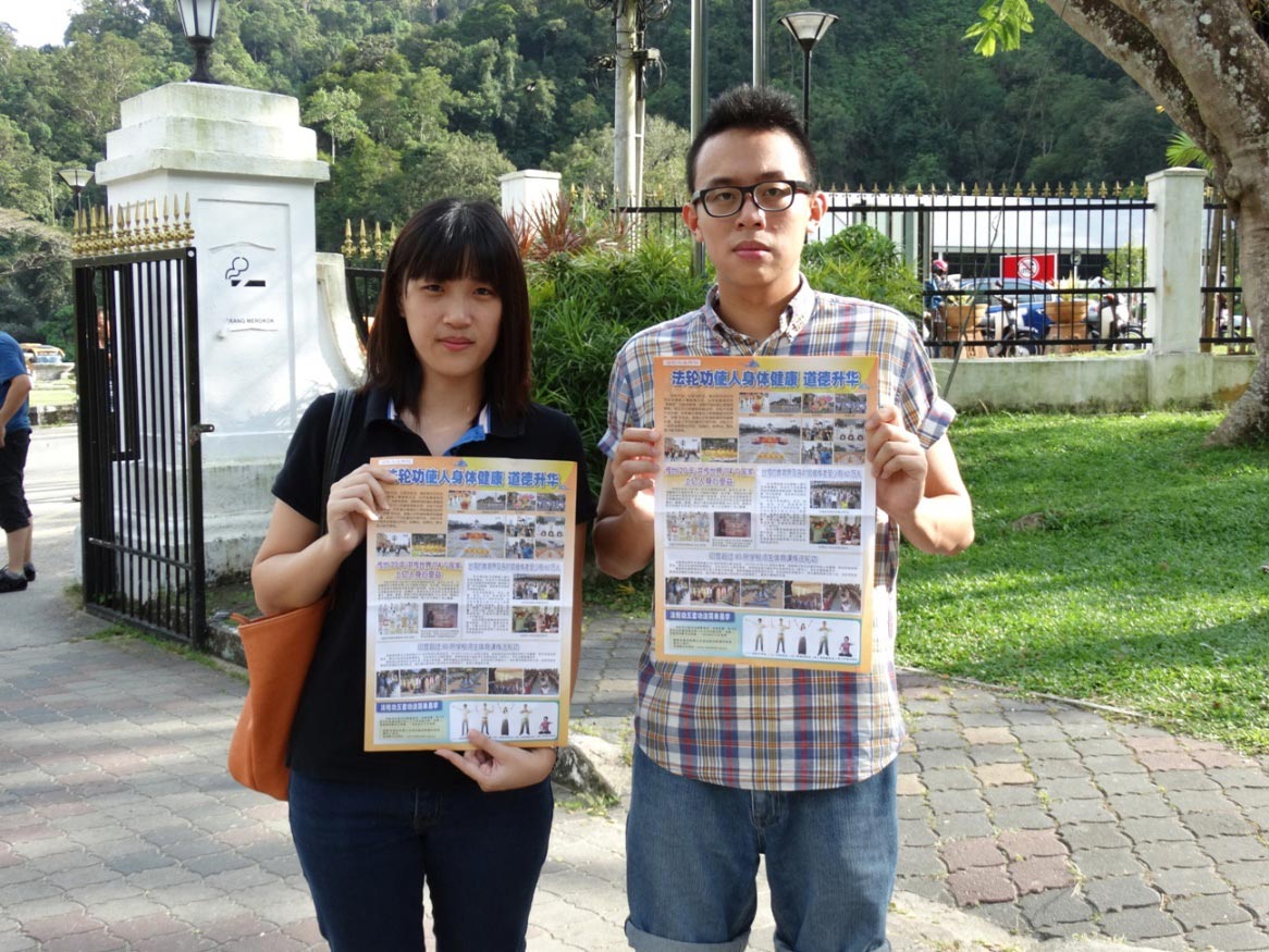 与此同时,部份法轮功学员于下午三点在槟城著名旅游景点植物公园(Botanic Garden)举行集体炼功,一些学员则在植物公园的正门口挂起了“敬请支持全球联署行动,呼吁联合国制止中共活摘器官血腥暴行!”横幅,进行征签,引起公众的关注。到此休闲的民众与游客经法轮功学员讲真相后,纷纷签名呼吁制止中共活摘器官的血腥暴行。