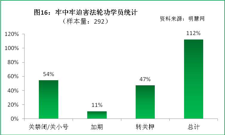 本报告调查的3653个致死案例中,共有8%的法轮功学员292个案例在最后一次致死迫害中受到牢中牢迫害,具体统计结果如下(图16):