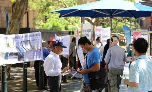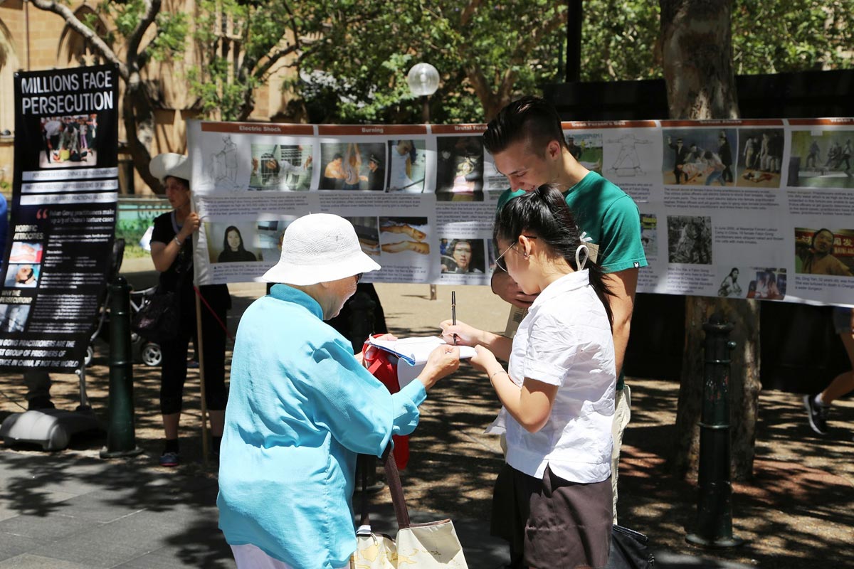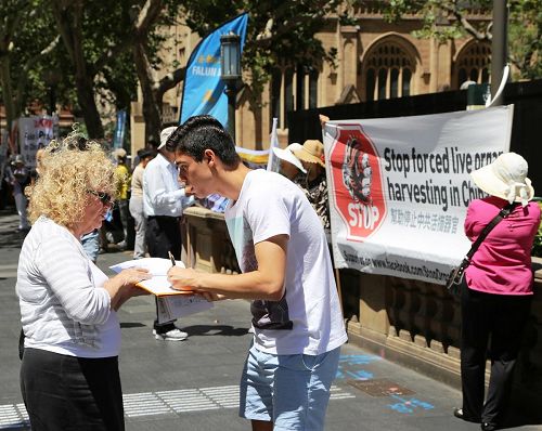 当天在悉尼市政厅广场前乔治街看到和听到了真相的悉尼民众,纷纷在反对和制止活摘器官征签表上签了名,表示支持。
