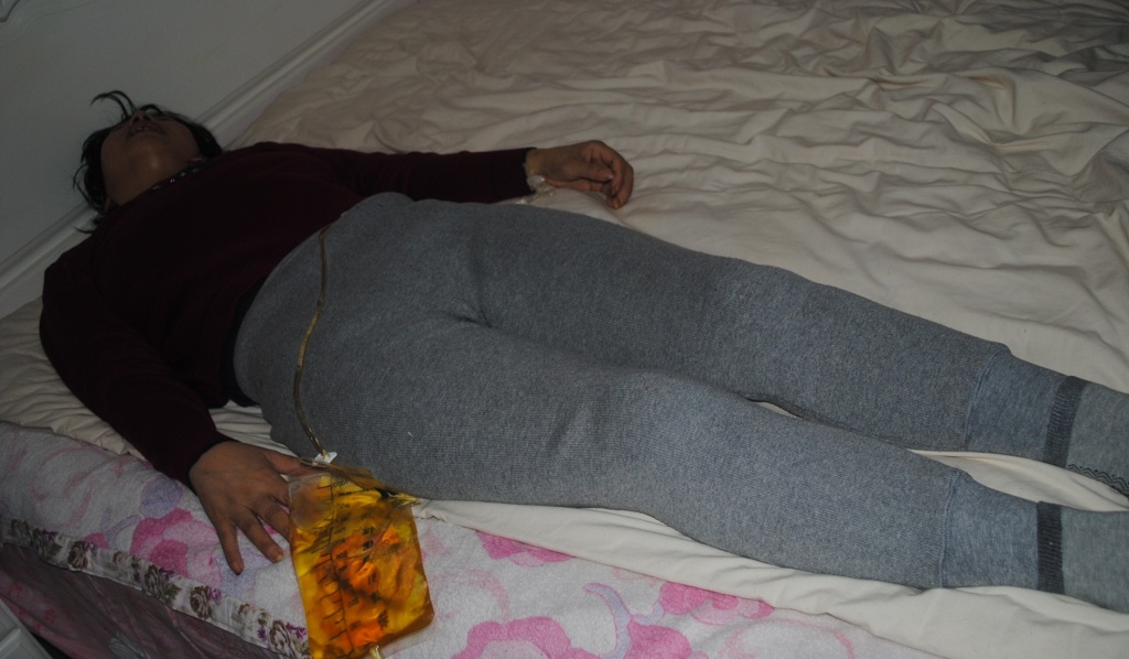 ![]() 图为挂着尿袋、全身僵直的祁亚茹。 |