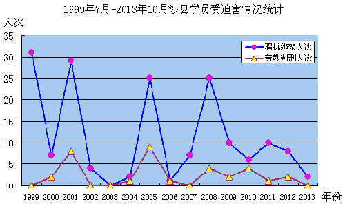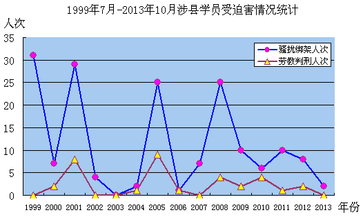 根据明慧网发表的资料,十四年来,涉县累计绑架法轮功学员超过一百六十七人次,有四人被迫害致死,其中劳教人数三十一人次,判刑人数三人,罚款在二十七万元以上,致残一人,遭受酷刑的人数超过十人。有关涉县法轮功学员的绑架、判刑、劳教统计情况见下图: