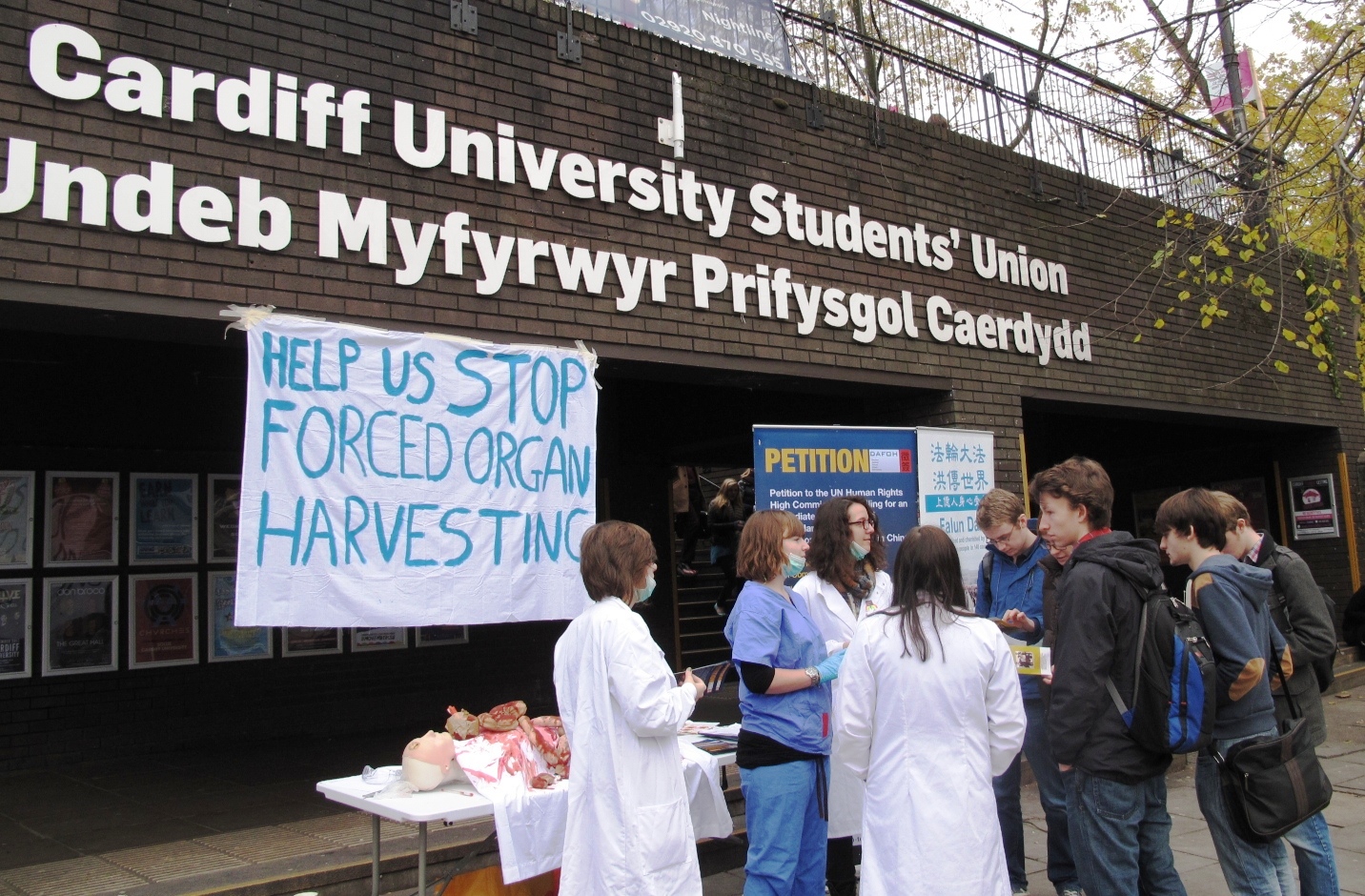当天的活动是由大赦国际组织卡迪夫大学分部主席艾姆珀·罗古思奇(Amber Roguski)发起的。两周前,艾姆珀和其他几位大赦国际成员参加了“医生反强摘器官协会”(DAFOH)在威尔士国民议会举行的“中共活摘器官说明会”,会上揭露的中共活摘法轮功学员器官罪行让这些密切关注世界人权问题的年轻人深感震惊。他们决定立即采取行动,在卡迪夫大学校园内举办反强摘器官征签,希望让更多的人知道正在中国发生的惊人事实,为制止这一反人类罪恶尽一份力量。